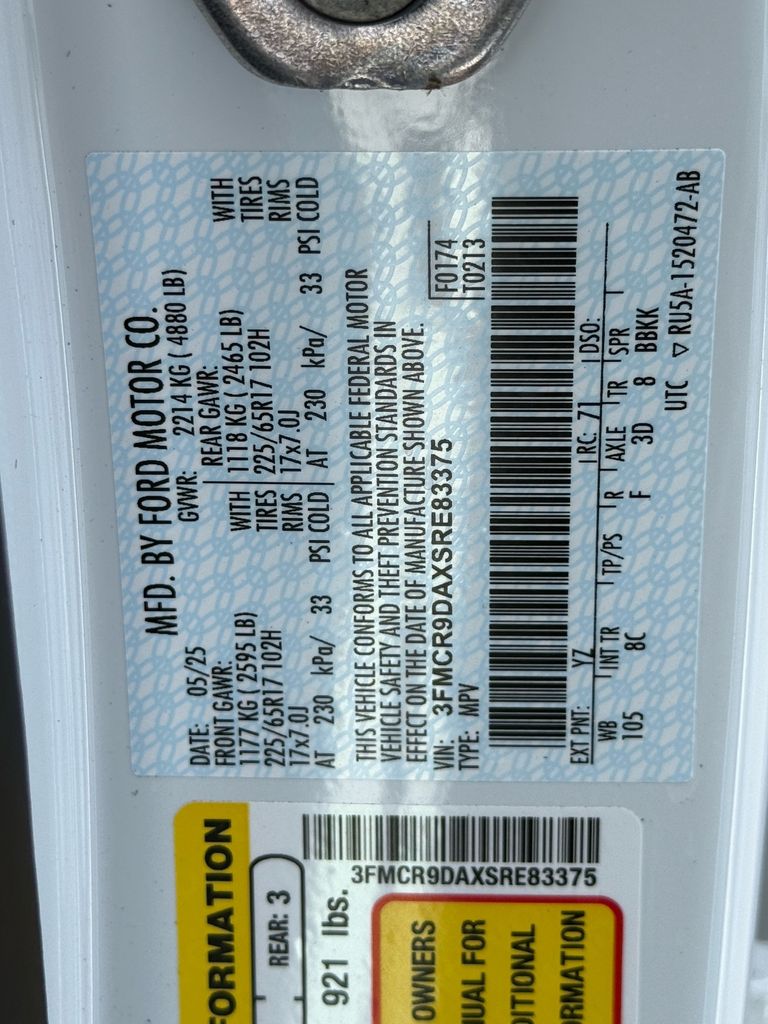 Badlands Tech Package (B&O Sound System by Bang & Olufsen, Connected Navigation, and HD Radio), Equipment Group 400A, 4-Wheel Disc Brakes, 6 Speakers, ABS brakes, Air Conditioning, Alloy wheels, AM/FM radio: SiriusXM, AM/FM Stereo, Auto High-beam Headlights, Auto-dimming Rear-View mirror, Automatic temperature control, Brake assist, Compass, Delay-off headlights, Driver door bin, Driver vanity mirror, Dual front impact airbags, Dual front side impact airbags, Electronic Stability Control, Emergency communication system: SYNC 4 911 Assist, Four wheel independent suspension, Front anti-roll bar, Front Bucket Seats, Front Center Armrest, Front fog lights, Front reading lights, Fully automatic headlights, Garage door transmitter, Heated door mirrors, Heated front seats, Heated steering wheel, Illuminated entry, Knee airbag, Leather Trimmed Front Bucket Seats, Low tire pressure warning, Memory seat, Occupant sensing airbag, Outside temperature display, Overhead airbag, Overhead console, Panic alarm, Passenger door bin, Passenger vanity mirror, Power door mirrors, Power driver seat, Power passenger seat, Power steering, Power windows, Radio data system, Rear anti-roll bar, Rear reading lights, Rear seat center armrest, Rear window defroster, Rear window wiper, Remote keyless entry, Security system, SiriusXM, Speed control, Speed-sensing steering, Speed-Sensitive Wipers, Split folding rear seat, Steering wheel mounted audio controls, SYNC 4 w/Enhanced Voice Recognition, Tachometer, Telescoping steering wheel, Tilt steering wheel, Traction control, Trip computer, Variably intermittent wipers, and Wheels: 17" Matte Black-Painted Aluminum. Price includes: $1500 - Retail Bonus Cash. Exp. 01/05/2026