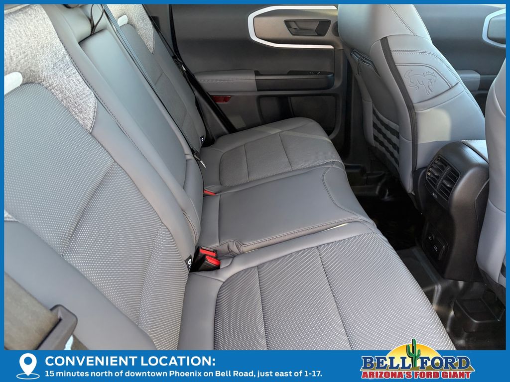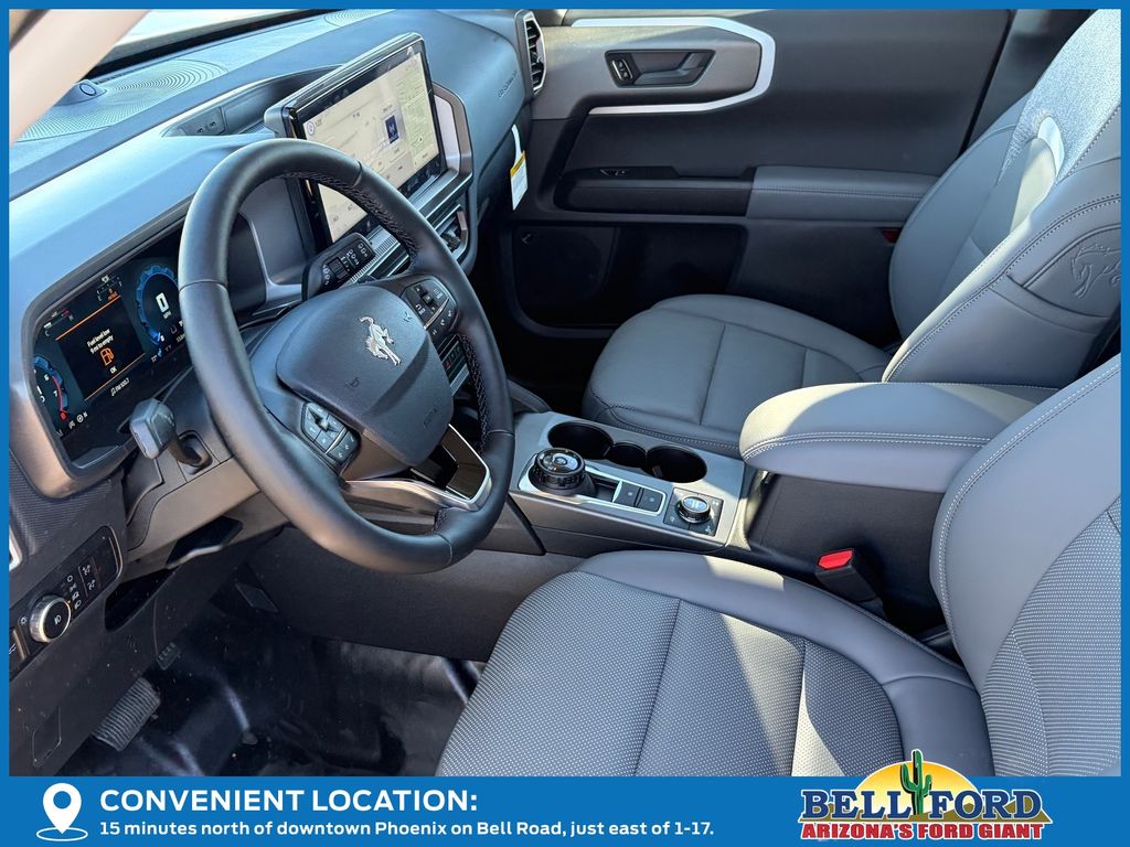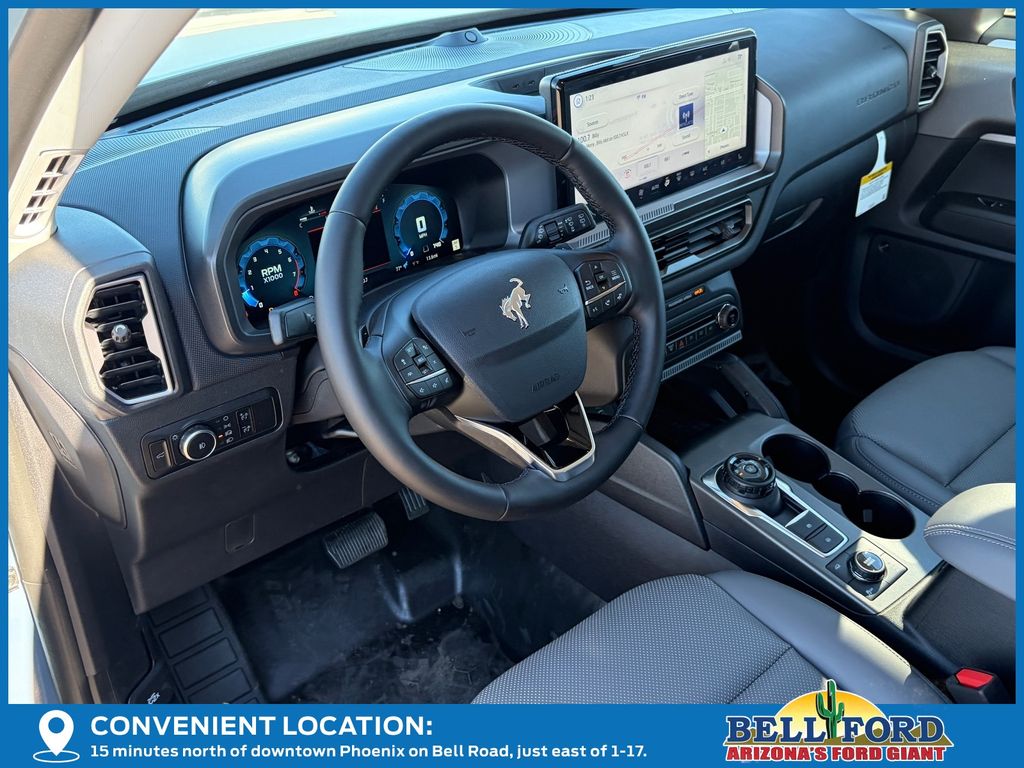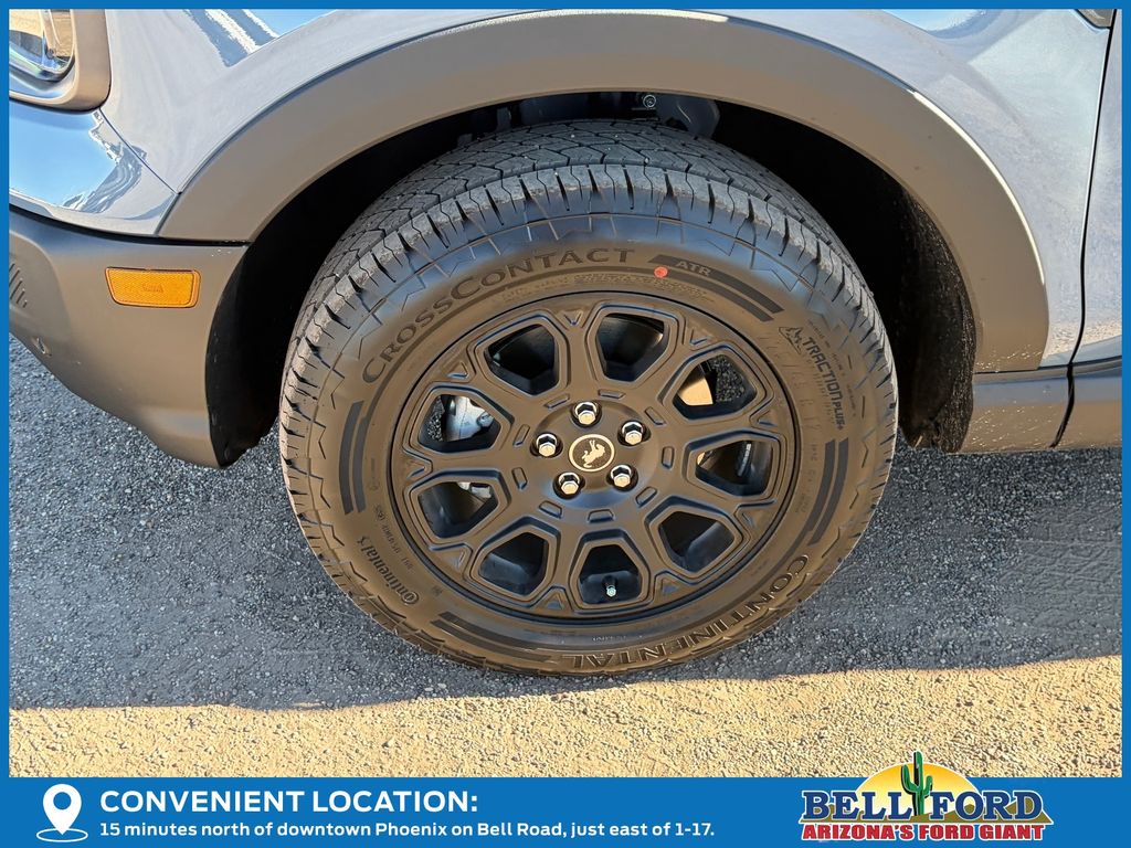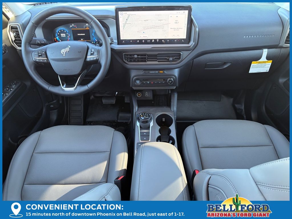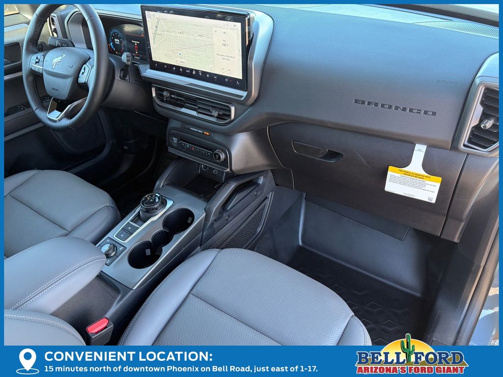 This Ford Bronco Sport is equipped with the following options: Badlands Tech Package (B&O Sound System by Bang & Olufsen, Connected Navigation, and HD Radio), Equipment Group 400A, 4-Wheel Disc Brakes, 6 Speakers, ABS brakes, Air Conditioning, Alloy wheels, AM/FM radio: SiriusXM, AM/FM Stereo, Auto High-beam Headlights, Auto-dimming Rear-View mirror, Automatic temperature control, Brake assist, Compass, Delay-off headlights, Driver door bin, Driver vanity mirror, Dual front impact airbags, Dual front side impact airbags, Electronic Stability Control, Emergency communication system: SYNC 4 911 Assist, Four wheel independent suspension, Front anti-roll bar, Front Bucket Seats, Front Center Armrest, Front fog lights, Front reading lights, Fully automatic headlights, Garage door transmitter, Heated door mirrors, Heated front seats, Heated steering wheel, Illuminated entry, Knee airbag, Leather Trimmed Front Bucket Seats, Low tire pressure warning, Memory seat, Occupant sensing airbag, Outside temperature display, Overhead airbag, Overhead console, Panic alarm, Passenger door bin, Passenger vanity mirror, Power door mirrors, Power driver seat, Power Moonroof, Power passenger seat, Power steering, Power windows, Radio data system, Rear anti-roll bar, Rear reading lights, Rear seat center armrest, Rear window defroster, Rear window wiper, Remote keyless entry, Security system, SiriusXM, Speed control, Speed-sensing steering, Speed-Sensitive Wipers, Split folding rear seat, Steering wheel mounted audio controls, SYNC 4 w/Enhanced Voice Recognition, Tachometer, Telescoping steering wheel, Tilt steering wheel, Traction control, Trip computer, Variably intermittent wipers, and Wheels: 17" Matte Black-Painted Aluminum. Price includes: $1000 - Final Days Mega Bonus Cash. Exp. 01/02/2026 $1500 - Retail Bonus Cash. Exp. 01/05/2026