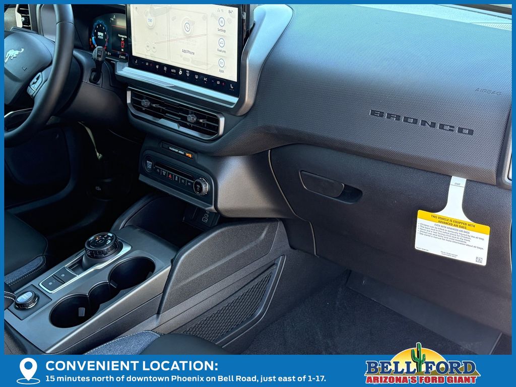 This Ford Bronco Sport is equipped with the following options: Equipment Group 300A, 4-Wheel Disc Brakes, 6 Speakers, ABS brakes, Air Conditioning, Alloy wheels, AM/FM radio: SiriusXM, AM/FM Stereo, Auto High-beam Headlights, Auto-dimming Rear-View mirror, Automatic temperature control, Brake assist, Compass, Delay-off headlights, Driver door bin, Driver vanity mirror, Dual front impact airbags, Dual front side impact airbags, Electronic Stability Control, Emergency communication system: SYNC 4 911 Assist, Four wheel independent suspension, Front anti-roll bar, Front Bucket Seats, Front Center Armrest, Front Driver/Passenger Seat Back Map Pockets, Front dual zone A/C, Front fog lights, Front reading lights, Fully automatic headlights, Garage door transmitter, Heated door mirrors, Heated front seats, Heated steering wheel, Illuminated entry, Knee airbag, Low tire pressure warning, Memory seat, Occupant sensing airbag, Outside temperature display, Overhead airbag, Overhead console, Panic alarm, Passenger door bin, Passenger vanity mirror, Power door mirrors, Power driver seat, Power passenger seat, Power steering, Power windows, Premium Trimmed Front Bucket Seats w/Ebony/Roast, Radio data system, Rain sensing wipers, Rear anti-roll bar, Rear Parking Sensors, Rear reading lights, Rear seat center armrest, Rear window defroster, Rear window wiper, Remote keyless entry, Security system, SiriusXM, Speed control, Speed-sensing steering, Speed-Sensitive Wipers, Split folding rear seat, Steering wheel mounted audio controls, SYNC 4 w/Enhanced Voice Recognition, Tachometer, Telescoping steering wheel, Tilt steering wheel, Traction control, Trip computer, Variably intermittent wipers, and Wheels: 18" Ebony Black-Painted Aluminum. Price includes: $3500 - Retail Customer Cash. Exp. 03/31/2026