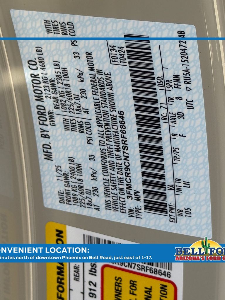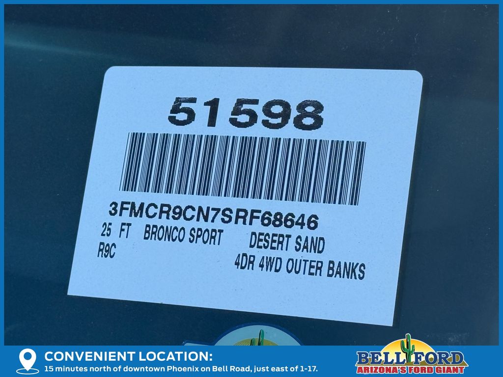 This Ford Bronco Sport is equipped with the following options: Equipment Group 300A, Outer Banks Tech Package+ (B&O Sound System by Bang & Olufsen, Connected Navigation, and HD Radio), 360-Degree Camera w/Trail & Split View, 4-Wheel Disc Brakes, 6 Speakers, ABS brakes, Air Conditioning, Alloy wheels, AM/FM radio: SiriusXM, AM/FM Stereo, Auto High-beam Headlights, Auto-dimming Rear-View mirror, Automatic temperature control, Brake assist, Compass, Delay-off headlights, Driver door bin, Driver vanity mirror, Dual front impact airbags, Dual front side impact airbags, Electronic Stability Control, Emergency communication system: SYNC 4 911 Assist, Four wheel independent suspension, Front anti-roll bar, Front Bucket Seats, Front Center Armrest, Front Driver/Passenger Seat Back Map Pockets, Front dual zone A/C, Front fog lights, Front Parking Sensors, Front reading lights, Fully automatic headlights, Garage door transmitter, Heated door mirrors, Heated front seats, Heated steering wheel, Illuminated entry, Knee airbag, Low tire pressure warning, Memory seat, Occupant sensing airbag, Outside temperature display, Overhead airbag, Overhead console, Panic alarm, Passenger door bin, Passenger vanity mirror, Power door mirrors, Power driver seat, Power passenger seat, Power steering, Power windows, Premium Trimmed Front Bucket Seats w/Ebony/Roast, Radio data system, Rain sensing wipers, Rear anti-roll bar, Rear Parking Sensors, Rear reading lights, Rear seat center armrest, Rear window defroster, Rear window wiper, Remote keyless entry, Reverse Brake Assist, Security system, SiriusXM, Speed control, Speed-sensing steering, Speed-Sensitive Wipers, Split folding rear seat, Steering wheel mounted audio controls, SYNC 4 w/Enhanced Voice Recognition, Tachometer, Telescoping steering wheel, Tilt steering wheel, Traction control, Trip computer, Variably intermittent wipers, and Wheels: 18" Ebony Black-Painted Aluminum. Price includes: $1000 - SUV Spike Retail Bonus Cash. Exp. 03/02/2026 $2000 - Retail Customer Cash. Exp. 03/31/2026