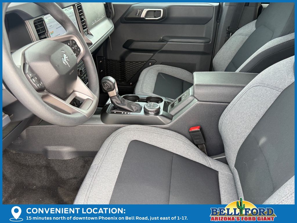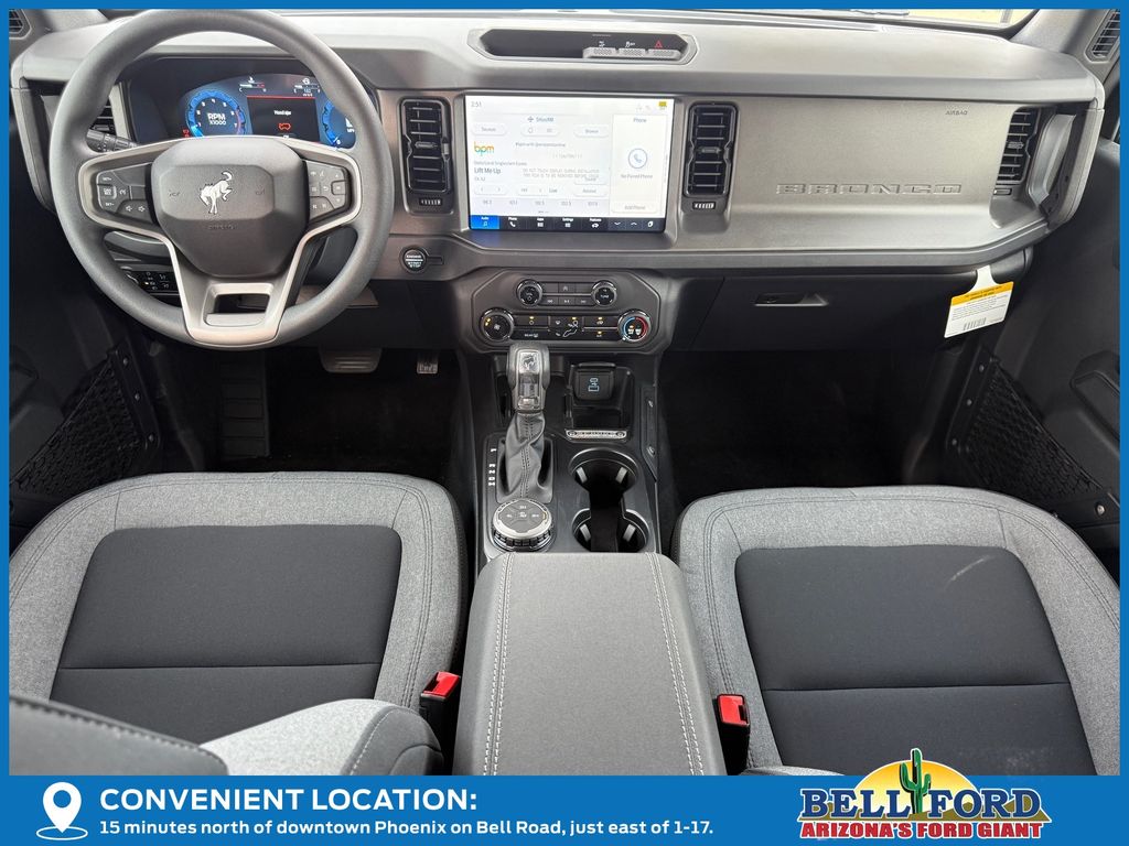 This Ford Bronco is equipped with the following options: Equipment Group 101A, 4-Wheel Disc Brakes, 4.46 Axle Ratio, 7 Speakers, ABS brakes, Air Conditioning, AM/FM radio: SiriusXM with 360L, AM/FM Stereo, Auto High-beam Headlights, Brake assist, Cloth Bucket Seats, Compass, Delay-off headlights, Driver door bin, Driver vanity mirror, Dual front impact airbags, Dual front side impact airbags, Electronic Stability Control, Emergency communication system: 911 Assist, Exterior Parking Camera Rear, Front anti-roll bar, Front Bucket Seats, Front Center Armrest, Front reading lights, Front wheel independent suspension, Fully automatic headlights, Heated door mirrors, Illuminated entry, Integrated roll-over protection, Internet access capable: FordPass Connect, Low tire pressure warning, Occupant sensing airbag, Outside temperature display, Overhead airbag, Overhead console, Panic alarm, Passenger door bin, Passenger vanity mirror, Power door mirrors, Power steering, Power windows, Radio data system, Remote keyless entry, Security system, SiriusXM w/360L, Speed control, Split folding rear seat, Steering wheel mounted audio controls, SYNC 4, Tachometer, Telescoping steering wheel, Tilt steering wheel, Traction control, Trip computer, Variably intermittent wipers, and Wheels: 16" Bright Polished Silver-Painted Steel. Price includes: $2500 - Retail Customer Cash. Exp. 03/31/2026 Price includes dealer added accessories totaling $11,370.