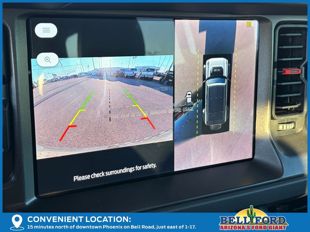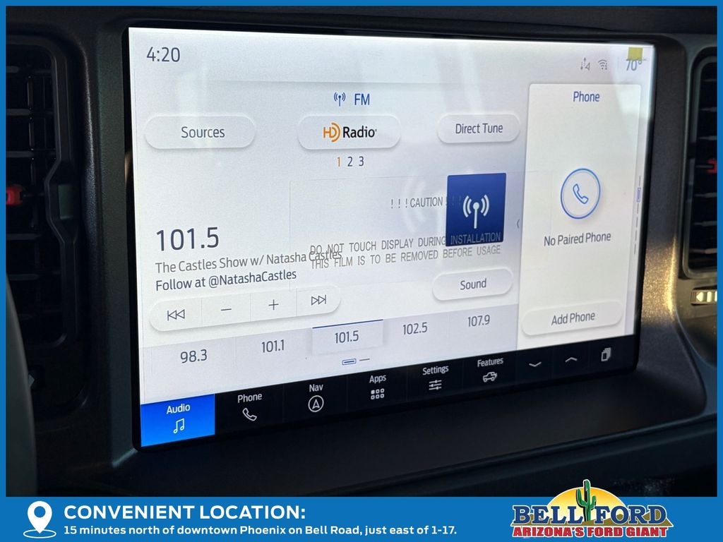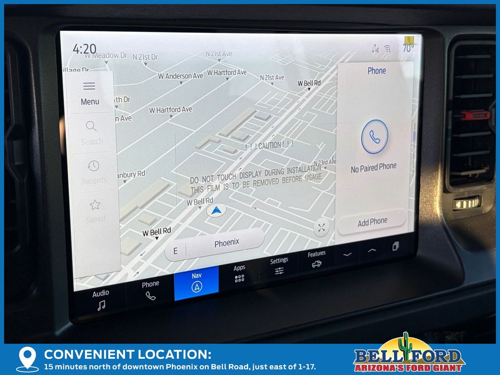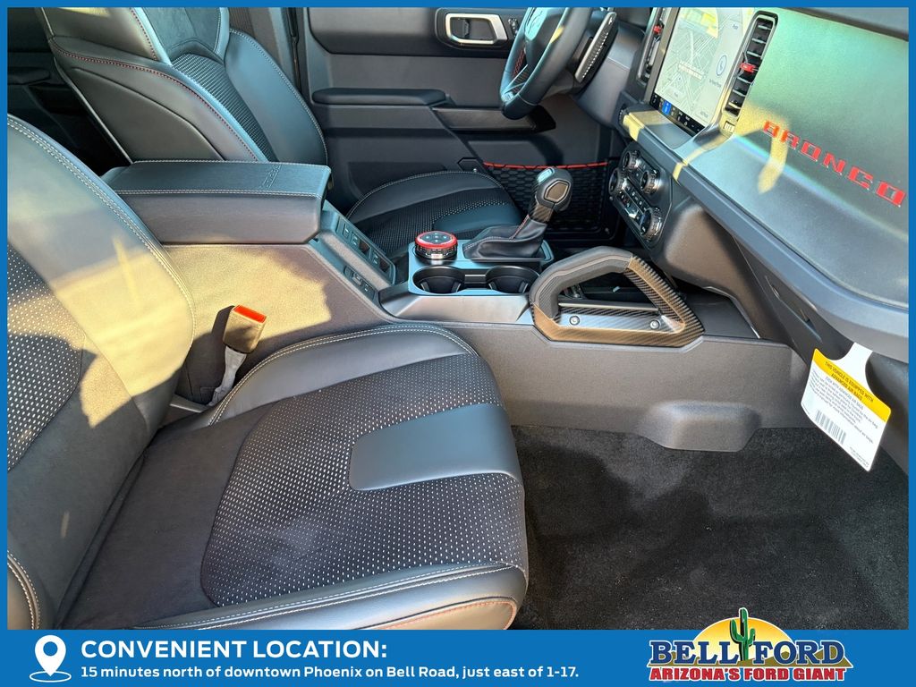 This Ford Bronco is equipped with the following options: Equipment Group 374A Lux Package, 12 Speakers, 4-Wheel Disc Brakes, ABS brakes, Air Conditioning, Alloy wheels, AM/FM radio: SiriusXM with 360L, Auto High-beam Headlights, Auto-dimming Rear-View mirror, Automatic temperature control, Body Color-Painted Hard Top, Brake assist, Compass, Connected Navigation, Convertible HardTop, Convertible roof lining, Delay-off headlights, Driver door bin, Driver vanity mirror, Dual front impact airbags, Dual front side impact airbags, Electronic Stability Control, Emergency communication system: 911 Assist, Exterior Parking Camera Rear, Front anti-roll bar, Front Bucket Seats, Front Center Armrest, Front dual zone A/C, Front fog lights, Front reading lights, Front wheel independent suspension, Fully automatic headlights, Garage door transmitter, Glass rear window, Hard Top Sound Deadening Headliner, Heated door mirrors, Heated front seats, Heated steering wheel, Illuminated entry, Integrated roll-over protection, Interior Carbon Fiber Pack, Internet access capable: FordPass Connect, Leather Shift Knob, Low tire pressure warning, Marine Grade Vinyl Bucket Seats, Navigation system: Connected Navigation, Occupant sensing airbag, Outside temperature display, Overhead airbag, Overhead console, Panic alarm, Passenger door bin, Passenger vanity mirror, Power door mirrors, Power steering, Power windows, Radio data system, Radio: B&O Sound System by Bang & Olufsen, Rear anti-roll bar, Rear seat center armrest, Rear window defroster, Rear window wiper, Rear-Window Defroster & Washer, Remote keyless entry, Security system, SiriusXM w/360L, Speed control, Split folding rear seat, Steering wheel mounted audio controls, SYNC 4, Tachometer, Telescoping steering wheel, Tilt steering wheel, Traction control, Trip computer, Turn signal indicator mirrors, Variably intermittent wipers, Voltmeter, Wheels: 17" Black High Gloss-Painted Aluminum, and Wheels: 17" Dark Carbonized Gray Alloy Painted.
