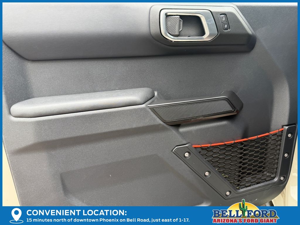 This Ford Bronco is equipped with the following options: Equipment Group 374A Lux Package, 12 Speakers, 4-Wheel Disc Brakes, ABS brakes, Air Conditioning, Alloy wheels, AM/FM radio: SiriusXM with 360L, Auto High-beam Headlights, Auto-dimming Rear-View mirror, Automatic temperature control, Brake assist, Compass, Connected Navigation, Convertible HardTop, Convertible roof lining, Delay-off headlights, Driver door bin, Driver vanity mirror, Dual front impact airbags, Dual front side impact airbags, Electronic Stability Control, Emergency communication system: 911 Assist, Exterior Parking Camera Rear, Front anti-roll bar, Front Bucket Seats, Front Center Armrest, Front dual zone A/C, Front fog lights, Front reading lights, Front wheel independent suspension, Fully automatic headlights, Garage door transmitter, Glass rear window, Hard Top Sound Deadening Headliner, Heated door mirrors, Heated front seats, Heated steering wheel, Illuminated entry, Integrated roll-over protection, Internet access capable: FordPass Connect, Leather Shift Knob, Low tire pressure warning, Marine Grade Vinyl Bucket Seats, Navigation system: Connected Navigation, Occupant sensing airbag, Outside temperature display, Overhead airbag, Overhead console, Panic alarm, Passenger door bin, Passenger vanity mirror, Power door mirrors, Power steering, Power windows, Radio data system, Radio: B&O Sound System by Bang & Olufsen, Rear anti-roll bar, Rear seat center armrest, Rear window defroster, Rear window wiper, Rear-Window Defroster & Washer, Remote keyless entry, Security system, Shadow Black Painted Hard Top, SiriusXM w/360L, Speed control, Split folding rear seat, Steering wheel mounted audio controls, SYNC 4, Tachometer, Telescoping steering wheel, Tilt steering wheel, Traction control, Trip computer, Turn signal indicator mirrors, Variably intermittent wipers, Voltmeter, and Wheels: 17" Black High Gloss-Painted Aluminum.
