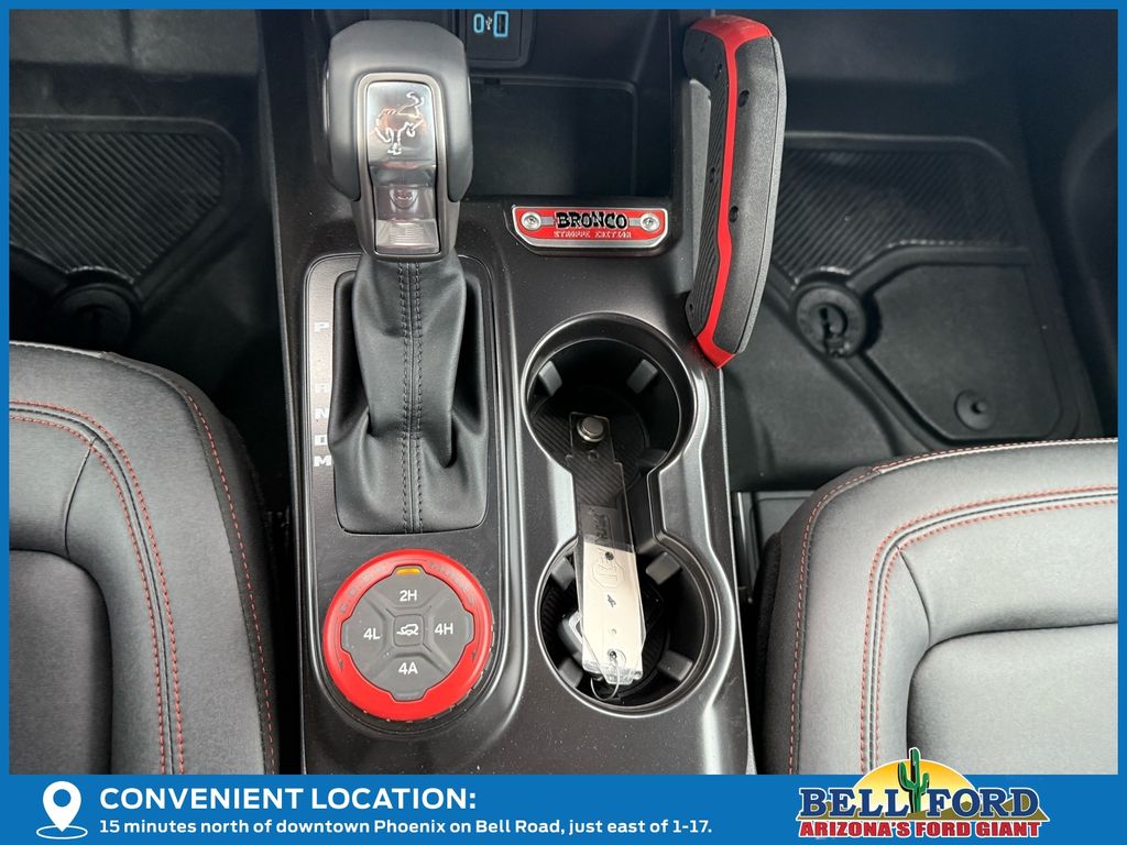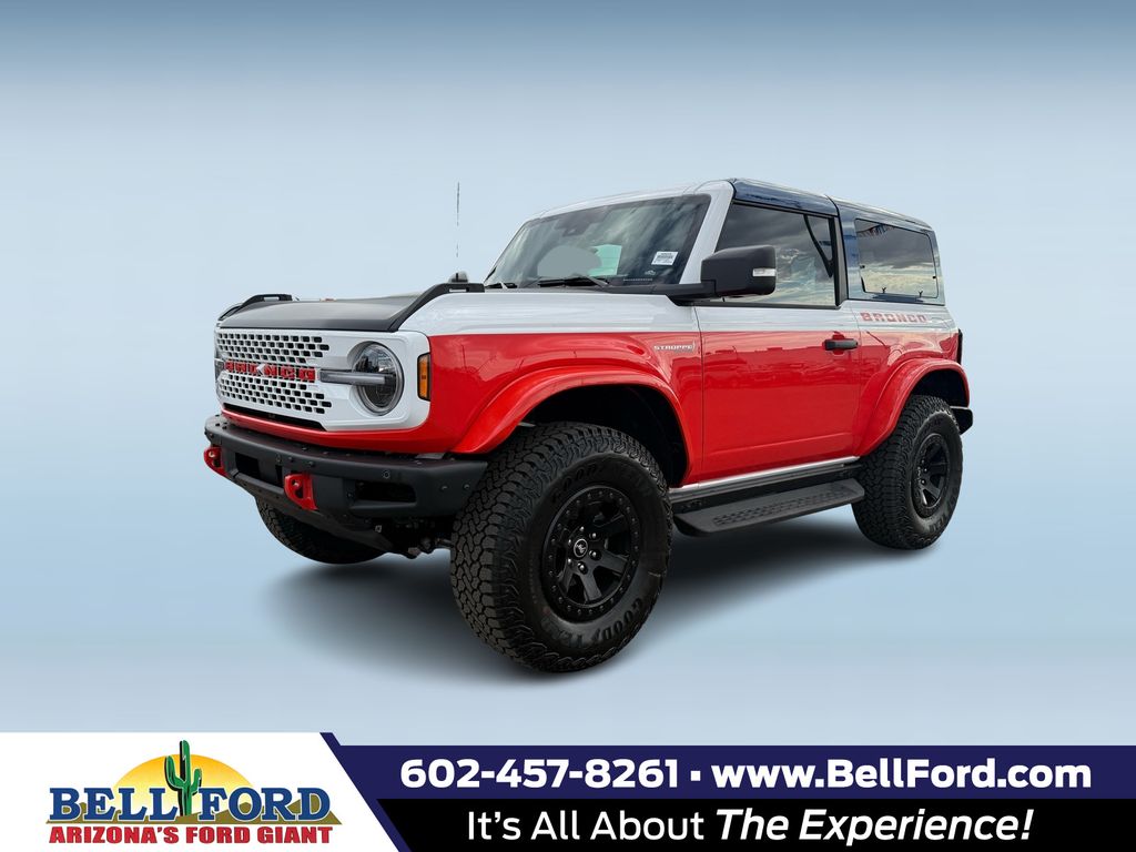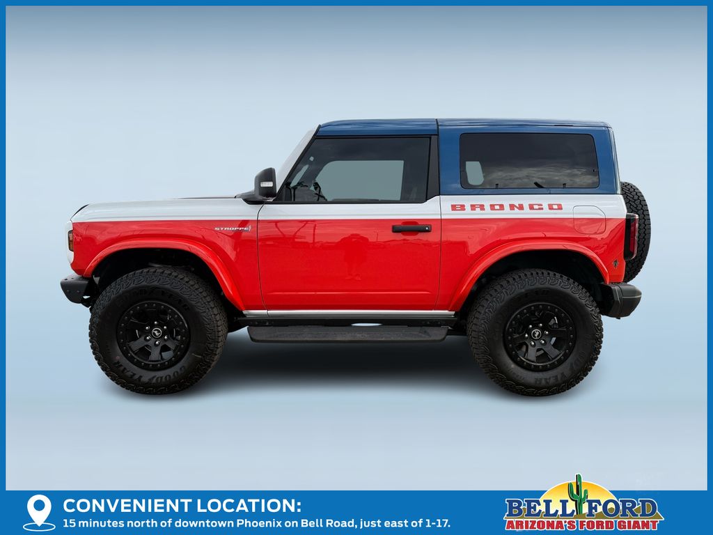 This Ford Bronco is equipped with the following options: ABS brakes, Active Cruise Control, Alloy wheels, Compass, Electronic Stability Control, Front dual zone A/C, Heated door mirrors, Heated front seats, Illuminated entry, Low tire pressure warning, Navigation System, Remote keyless entry, Traction control, 12 Speakers, 4-Wheel Disc Brakes, Air Conditioning, AM/FM radio: SiriusXM with 360L, Auto High-beam Headlights, Auto-dimming Rear-View mirror, Automatic temperature control, Brake assist, Connected Navigation, Convertible HardTop, Convertible roof lining, Delay-off headlights, Driver door bin, Driver vanity mirror, Dual front impact airbags, Dual front side impact airbags, Emergency communication system: 911 Assist, Exterior Parking Camera Rear, Front anti-roll bar, Front Bucket Seats, Front Center Armrest, Front reading lights, Front wheel independent suspension, Fully automatic headlights, Garage door transmitter, Glass rear window, Heated steering wheel, Integrated roll-over protection, Leather Shift Knob, Navigation system: Connected Navigation, Occupant sensing airbag, Outside temperature display, Overhead airbag, Overhead console, Panic alarm, Passenger door bin, Passenger vanity mirror, Power door mirrors, Power steering, Power windows, Radio data system, Radio: B&O Sound System by Bang & Olufsen, Rear anti-roll bar, Rear window defroster, Rear window wiper, Security system, SiriusXM w/360L, Speed control, Split folding rear seat, Steering wheel mounted audio controls, SYNC 4, Tachometer, Telescoping steering wheel, Tilt steering wheel, Trip computer, Turn signal indicator mirrors, Unique Vinyl Bucket Seats, Variably intermittent wipers, Voltmeter, and Wheels: 17" Unique Matte Black-Painted Alloy. Price includes: $5000 - Bronco Stroppe Baja Bonus Cash. Exp. 03/31/2026