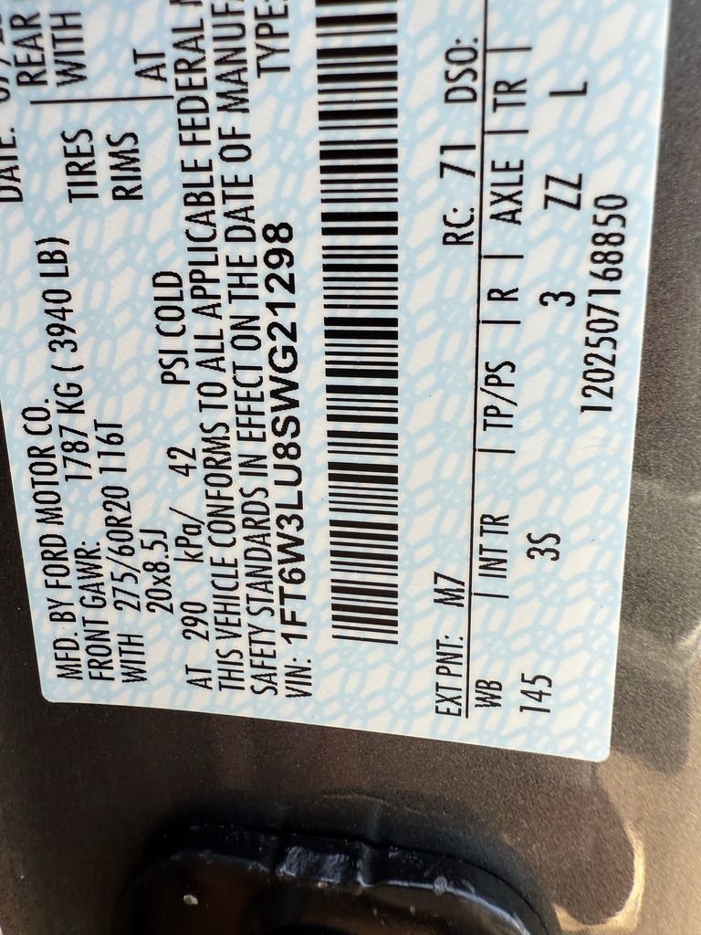 Equipment Group 312A Standard, 4-Wheel Disc Brakes, 8 Speakers, ABS brakes, ActiveX Trimmed Heated Front Seats, Adjustable pedals, Air Conditioning, Alloy wheels, Auto High-beam Headlights, Auto-dimming Rear-View mirror, Automatic temperature control, Brake assist, Bumpers: body-color, Compass, Delay-off headlights, Driver door bin, Driver vanity mirror, Dual front impact airbags, Dual front side impact airbags, Electronic Stability Control, Emergency communication system: SYNC 4 911 Assist, Four wheel independent suspension, Front anti-roll bar, Front Bucket Seats, Front Center Armrest, Front dual zone A/C, Front reading lights, Fully automatic headlights, Heated door mirrors, Heated front seats, Heated steering wheel, Illuminated entry, Knee airbag, Low tire pressure warning, Mobile Power Cord (120/240V), Navigation system: Connected Navigation, Occupant sensing airbag, Outside temperature display, Overhead airbag, Overhead console, Panic alarm, Passenger door bin, Passenger vanity mirror, Power door mirrors, Power driver seat, Power passenger seat, Power steering, Power windows, Radio data system, Radio: B&O Sound System by Bang & Olufsen, Rear anti-roll bar, Rear reading lights, Rear step bumper, Rear window defroster, Remote keyless entry, Security system, Speed control, Speed-sensing steering, Split folding rear seat, Steering wheel mounted audio controls, SYNC 4A w/Enhanced Voice Recognition, Tailgate Step w/Tailgate Work Surface, Telescoping steering wheel, Tilt steering wheel, Traction control, Trip computer, Turn signal indicator mirrors, Variably intermittent wipers, and Wheels: 20" Alloy Dark Carbonized Gray. Price includes: $1000 - Retail Bonus Cash. Exp. 01/05/2026 $4000 - Retail Customer Cash. Exp. 01/05/2026