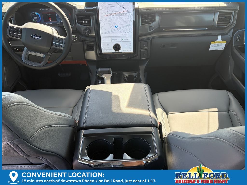 This Ford F-150 Lightning is equipped with the following options: Equipment Group 312A Standard, 4-Wheel Disc Brakes, 8 Speakers, ABS brakes, ActiveX Trimmed Heated Front Seats, Adjustable pedals, Air Conditioning, Alloy wheels, Auto High-beam Headlights, Auto-dimming Rear-View mirror, Automatic temperature control, Brake assist, Bumpers: body-color, Compass, Delay-off headlights, Driver door bin, Driver vanity mirror, Dual front impact airbags, Dual front side impact airbags, Electronic Stability Control, Emergency communication system: SYNC 4 911 Assist, Four wheel independent suspension, Front anti-roll bar, Front Bucket Seats, Front Center Armrest, Front dual zone A/C, Front reading lights, Fully automatic headlights, Heated door mirrors, Heated front seats, Heated steering wheel, Illuminated entry, Internet access capable: FordPass Connect 4G, Knee airbag, Low tire pressure warning, Mobile Power Cord (120/240V), Navigation system: Connected Navigation, Occupant sensing airbag, Outside temperature display, Overhead airbag, Overhead console, Panic alarm, Passenger door bin, Passenger vanity mirror, Power door mirrors, Power driver seat, Power passenger seat, Power steering, Power windows, Pro Power Onboard - 9.6 kW Exportable Power, Radio data system, Radio: B&O Sound System by Bang & Olufsen, Rear anti-roll bar, Rear reading lights, Rear step bumper, Rear window defroster, Remote keyless entry, Security system, Speed control, Speed-sensing steering, Split folding rear seat, Steering wheel mounted audio controls, SYNC 4A w/Enhanced Voice Recognition, Tailgate Step w/Tailgate Work Surface, Telescoping steering wheel, Tilt steering wheel, Traction control, Trip computer, Turn signal indicator mirrors, Variably intermittent wipers, and Wheels: 20" Alloy Dark Carbonized Gray.