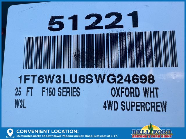 Equipment Group 312A Standard, 4-Wheel Disc Brakes, 8 Speakers, ABS brakes, ActiveX Trimmed Heated Front Seats, Adjustable pedals, Air Conditioning, Alloy wheels, Auto High-beam Headlights, Auto-dimming Rear-View mirror, Automatic temperature control, Brake assist, Bumpers: body-color, Compass, Delay-off headlights, Driver door bin, Driver vanity mirror, Dual front impact airbags, Dual front side impact airbags, Electronic Stability Control, Emergency communication system: SYNC 4 911 Assist, First Aid Kit w/Ford Logo, Four wheel independent suspension, Front anti-roll bar, Front Bucket Seats, Front Center Armrest, Front dual zone A/C, Front reading lights, Fully automatic headlights, Heated door mirrors, Heated front seats, Heated steering wheel, Illuminated entry, Knee airbag, Low tire pressure warning, Mobile Power Cord (120/240V), Navigation system: Connected Navigation, Occupant sensing airbag, Outside temperature display, Overhead airbag, Overhead console, Panic alarm, Passenger door bin, Passenger vanity mirror, Power door mirrors, Power driver seat, Power passenger seat, Power steering, Power windows, Radio data system, Radio: B&O Sound System by Bang & Olufsen, Rear anti-roll bar, Rear reading lights, Rear step bumper, Rear window defroster, Remote keyless entry, Security system, Speed control, Speed-sensing steering, Split folding rear seat, Steering wheel mounted audio controls, SYNC 4A w/Enhanced Voice Recognition, Tailgate Step w/Tailgate Work Surface, Telescoping steering wheel, Tilt steering wheel, Traction control, Trip computer, Turn signal indicator mirrors, Variably intermittent wipers, and Wheels: 20" Alloy Dark Carbonized Gray. Price includes: $1000 - Retail Bonus Cash. Exp. 01/05/2026