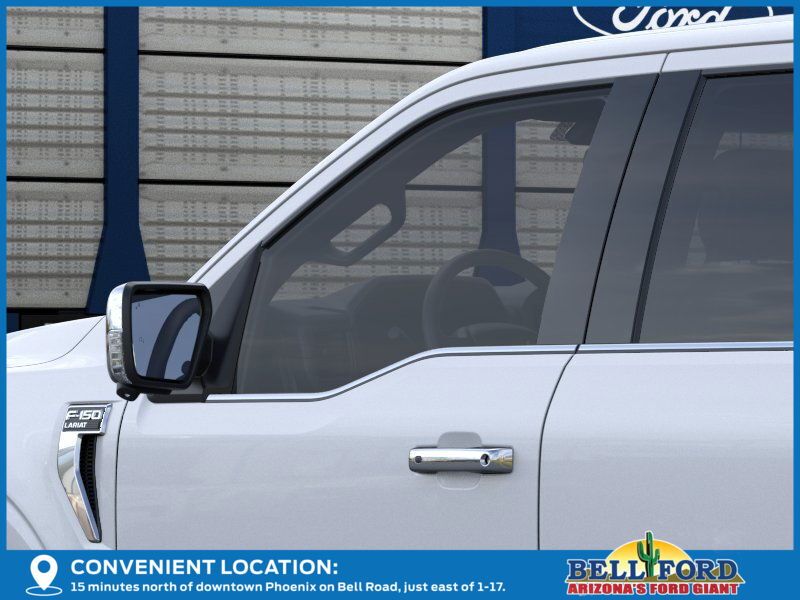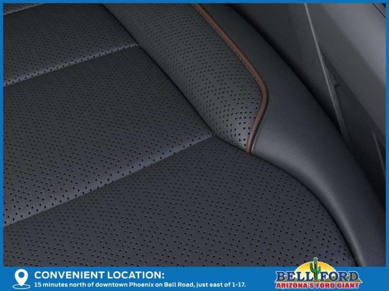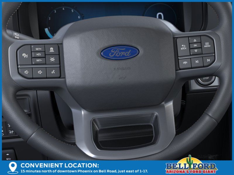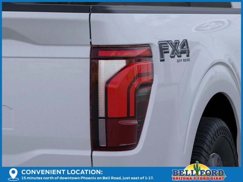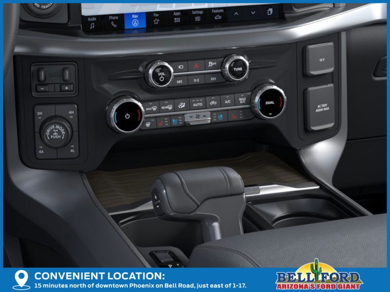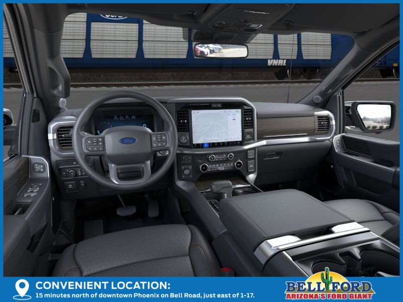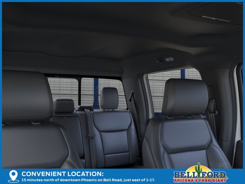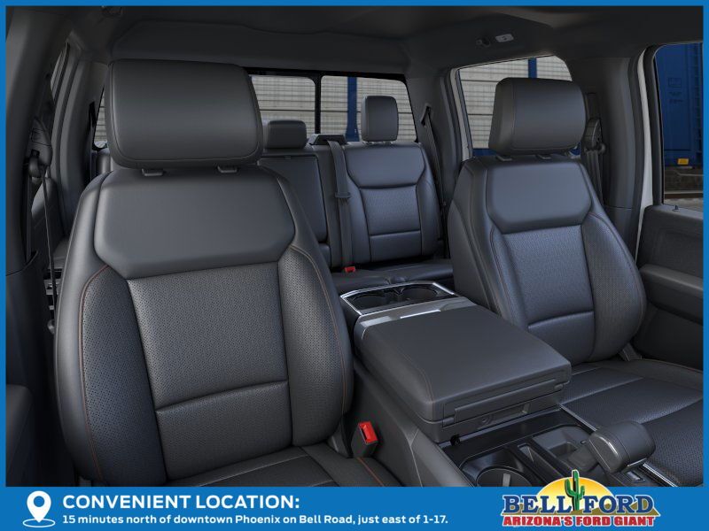 This Ford F-150 is equipped with the following options: Equipment Group 502A High (2nd Row Heated Seats, Ambient Lighting - Ice Blue Color Only, Heads-Up Display, Illuminated Driver & Passenger Visors, Power-Sliding Rear Window, Radio: B&O Unleashed Sound System by Bang & Olufsen, and Wheels: 20" Chrome-Like PVD), FX4 Off-Road Package (4x4 FX4 Off-Road Bodyside Decal, Hill Descent Control, Monotube Rear Shocks, Off-Road Tuned Front Shock Absorbers, Rock Crawl Mode, and Tray Style Floor Liner w/o Carpet Mats), Mobile Office Package (Console Worksurface, Partitioned Lockable Rear Storage, and Wireless Charging), Tow/Haul Package, 4WD, 4-Wheel Disc Brakes, 8 Speakers, ABS brakes, ActiveX Trimmed Bucket Seats, Adjustable pedals, Air Conditioning, Alloy wheels, AM/FM radio: SiriusXM with 360L, Auto High-beam Headlights, Auto-dimming door mirrors, Auto-dimming Rear-View mirror, Automatic temperature control, Brake assist, Bumpers: chrome, Chrome wheels, Compass, Delay-off headlights, Driver door bin, Driver vanity mirror, Dual front impact airbags, Dual front side impact airbags, Electronic Stability Control, Emergency communication system: SYNC 4 911 Assist, First Aid Kit w/Ford Logo, Front anti-roll bar, Front Bucket Seats, Front Center Armrest, Front dual zone A/C, Front fog lights, Front reading lights, Front wheel independent suspension, Fully automatic headlights, Garage door transmitter, Heated door mirrors, Heated front seats, Heated steering wheel, Illuminated entry, Internet access capable: FordPass Connect 5G, Low tire pressure warning, Memory seat, Navigation system: Connected Navigation, Occupant sensing airbag, Outside temperature display, Overhead airbag, Overhead console, Panic alarm, Passenger door bin, Passenger vanity mirror, Pedal memory, Power door mirrors, Power driver seat, Power passenger seat, Power steering, Power windows, Radio data system, Radio: B&O Sound System by Bang & Olufsen, Rain sensing wipers, Rear reading lights, Rear seat center armrest, Rear step bumper, Rear window defroster, Remote keyless entry, Security system, Speed control, Split folding rear seat, Steering wheel mounted audio controls, SYNC 4 w/Enhanced Voice Recognition, Tachometer, Telescoping steering wheel, Tilt steering wheel, Traction control, Trip computer, Turn signal indicator mirrors, Variably intermittent wipers, Ventilated front seats, Voltmeter, and Wheels: 18" Chrome-Like PVD.