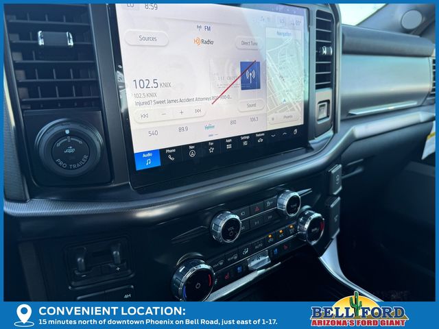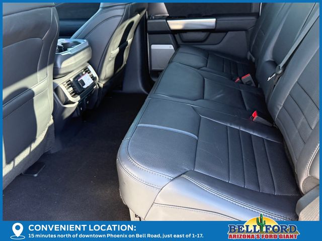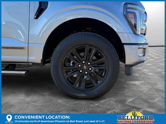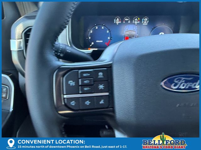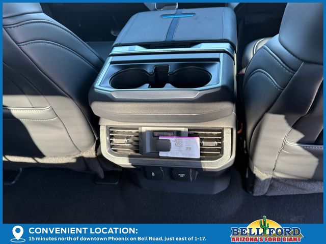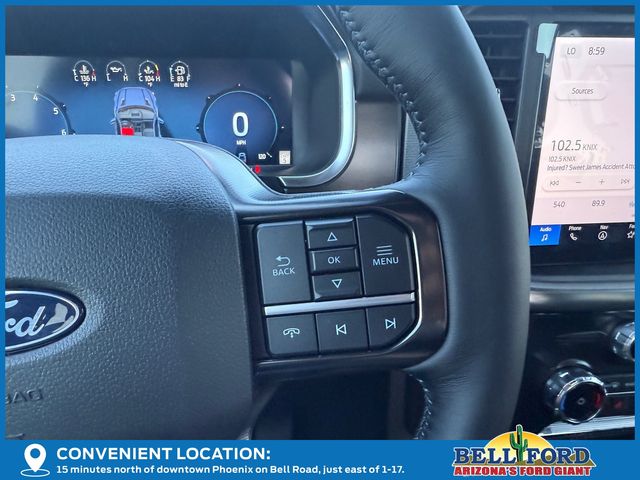 Equipment Group 701A Standard, 3.5L PowerBoost Full-Hybrid V6, 4WD, 4-Wheel Disc Brakes, 8 Speakers, ABS brakes, Adjustable pedals, Air Conditioning, Alloy wheels, AM/FM radio: SiriusXM with 360L, Auto High-beam Headlights, Auto tilt-away steering wheel, Auto-dimming door mirrors, Auto-dimming Rear-View mirror, Automatic temperature control, Brake assist, Bumpers: body-color, Compass, Delay-off headlights, Driver door bin, Driver vanity mirror, Dual front impact airbags, Dual front side impact airbags, Electronic Stability Control, Emergency communication system: SYNC 4 911 Assist, Front anti-roll bar, Front Bucket Seats, Front Center Armrest, Front dual zone A/C, Front fog lights, Front reading lights, Front wheel independent suspension, Fully automatic headlights, Garage door transmitter, Heated door mirrors, Heated front seats, Heated rear seats, Heated steering wheel, Illuminated entry, Leather steering wheel, LED Sideview Mirror Spotlights, Low tire pressure warning, Memory seat, Navigation system: Connected Navigation, Occupant sensing airbag, Outside temperature display, Overhead airbag, Overhead console, Panic alarm, Passenger door bin, Passenger vanity mirror, Pedal memory, Power door mirrors, Power driver seat, Power passenger seat, Power steering, Power Telescoping/Glass/Folding Trailer Tow Mirrors, Power windows, Radio data system, Radio: B&O Sound System by Bang & Olufsen, Rain sensing wipers, Rear reading lights, Rear seat center armrest, Rear step bumper, Rear window defroster, Remote keyless entry, Security system, Speed control, Split folding rear seat, Steering wheel memory, Steering wheel mounted audio controls, SYNC 4 w/Enhanced Voice Recognition, Tachometer, Telescoping steering wheel, Tilt steering wheel, Tough Bed Spray-In Bedliner, Traction control, Tray Style Floor Liner, Trip computer, Turn signal indicator mirrors, Unique Multi-Contour Leather Bucket Seats, Variably intermittent wipers, Ventilated front seats, Voltmeter, Wheel Well Liner, and Wheels: 20" Painted Gloss Ebony Black.