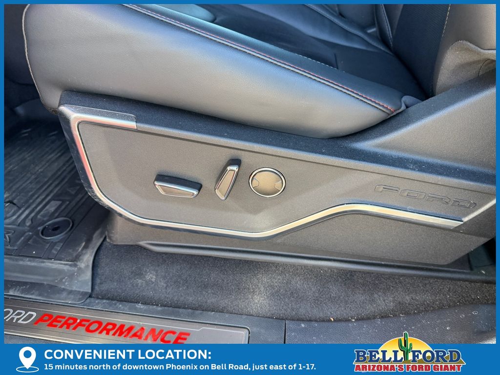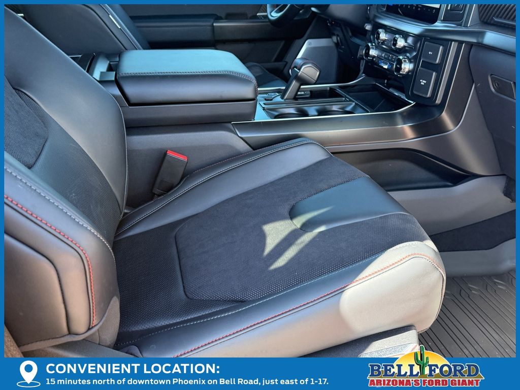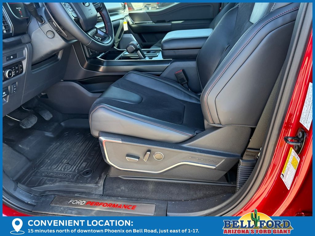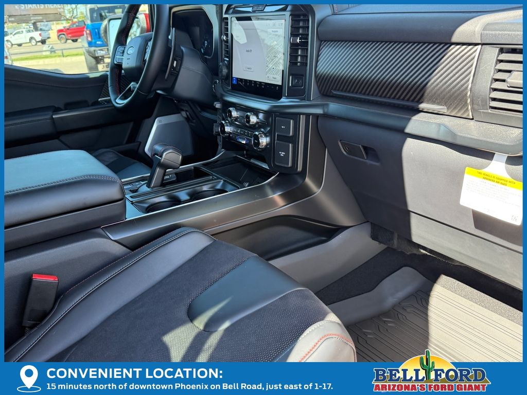 This Ford F-150 is equipped with the following options: Equipment Group 802A Raptor 37 (Carbon Fiber Interior Appliques, Dual Valve Shocks, Modular Front Bumper, RECARO Alcantara Suede Front Seats, and Wheels: Raptor 37 Unique 17" Cast Aluminum), 4WD, 14 Speakers, 17" Cast Aluminum Wheels, 4-Wheel Disc Brakes, ABS brakes, Adjustable pedals, Air Conditioning, Alloy wheels, AM/FM radio: SiriusXM with 360L, Auto High-beam Headlights, Auto tilt-away steering wheel, Auto-dimming door mirrors, Auto-dimming Rear-View mirror, Automatic temperature control, Brake assist, Bumpers: body-color, Compass, Delay-off headlights, Driver door bin, Driver vanity mirror, Dual front impact airbags, Dual front side impact airbags, Electronic Locking w/4.10 Axle Ratio, Electronic Stability Control, Emergency communication system: SYNC 4 911 Assist, Front anti-roll bar, Front Bucket Seats, Front Center Armrest, Front dual zone A/C, Front fog lights, Front License Plate Bracket, Front reading lights, Front wheel independent suspension, Fully automatic headlights, Garage door transmitter, Heads-Up Display, Heated door mirrors, Heated front seats, Heated rear seats, Heated steering wheel, Illuminated entry, Internet access capable: FordPass Connect 5G, Lane Departure Warning System, Leather steering wheel, Leather Trimmed Seats, Low tire pressure warning, Memory seat, Navigation system: Connected Navigation, Occupant sensing airbag, Outside temperature display, Overhead airbag, Overhead console, Panic alarm, Passenger door bin, Passenger vanity mirror, Pedal memory, Power door mirrors, Power driver seat, Power passenger seat, Power steering, Power windows, Radio data system, Radio: B&O Unleashed Sound System by Bang & Olufsen, Rain sensing wipers, Rear reading lights, Rear step bumper, Rear window defroster, Remote keyless entry, Security system, Speed control, Speed-sensing steering, Split folding rear seat, Steering wheel memory, Steering wheel mounted audio controls, SYNC 4 w/Enhanced Voice Recognition, Tachometer, Telescoping steering wheel, Tilt steering wheel, Tough Bed Spray-In Bedliner, Traction control, Trip computer, Turn signal indicator mirrors, Twin Panel Moonroof, Variably intermittent wipers, and Ventilated front seats.