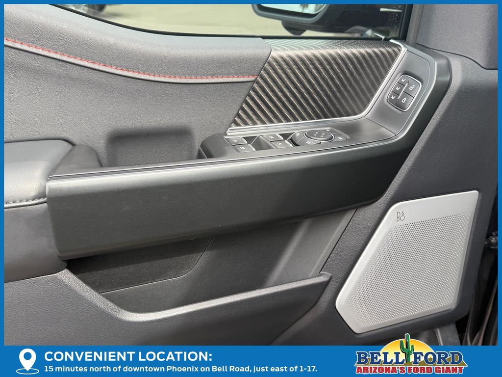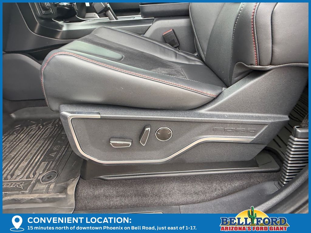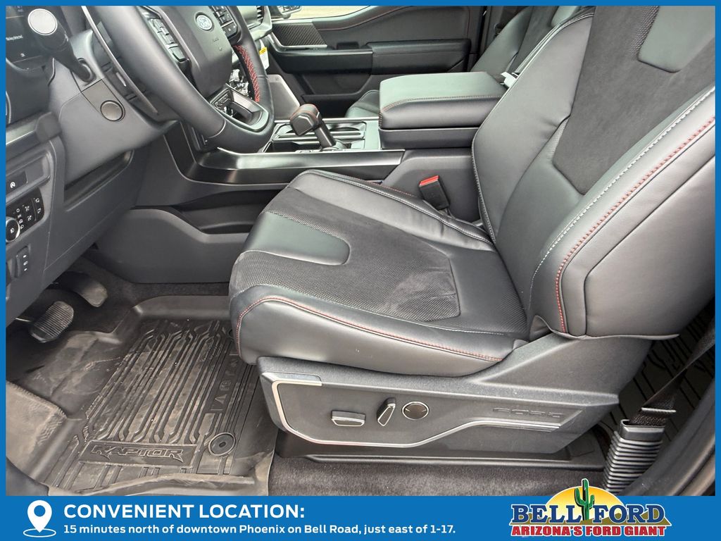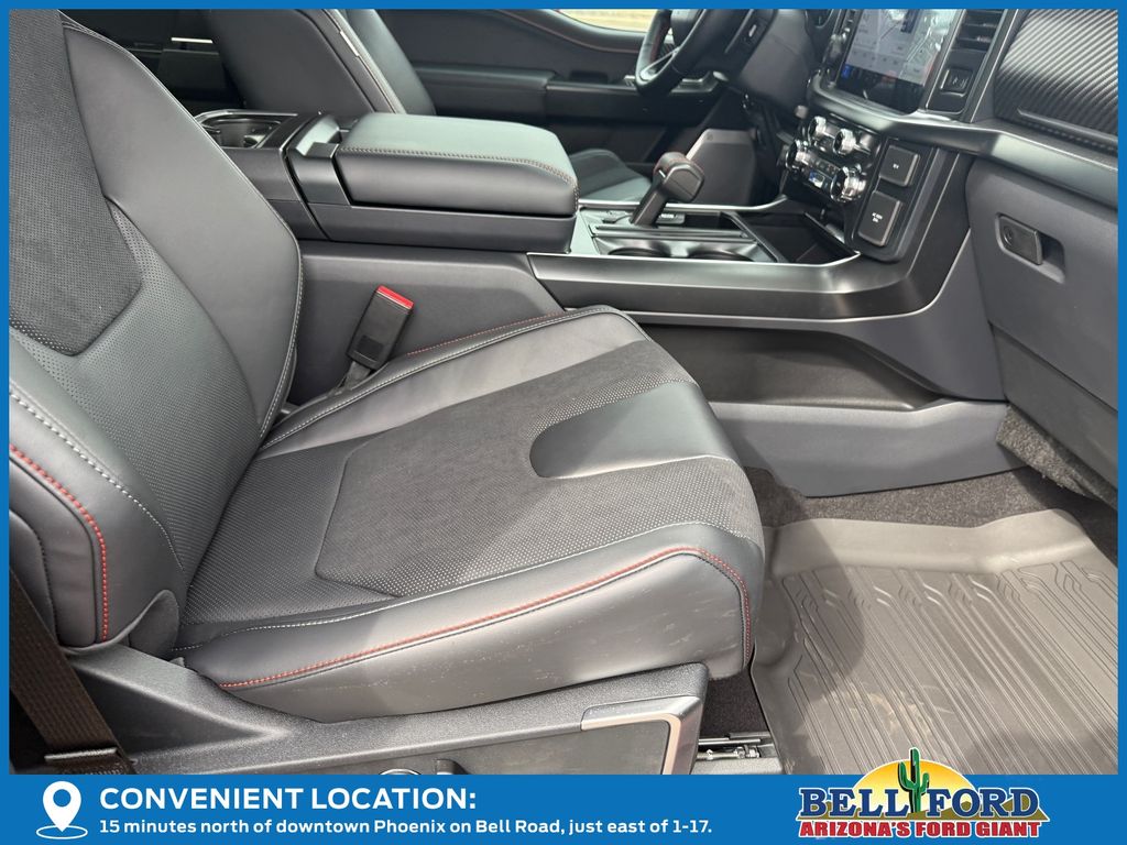 This Ford F-150 is equipped with the following options: Equipment Group 802A Raptor 37 (Carbon Fiber Interior Appliques, Dual Valve Shocks, Modular Front Bumper, RECARO Alcantara Suede Front Seats, and Wheels: Raptor 37 Unique 17" Cast Aluminum), 4WD, 14 Speakers, 17" Cast Aluminum Wheels, 4-Wheel Disc Brakes, ABS brakes, Adjustable pedals, Air Conditioning, Alloy wheels, AM/FM radio: SiriusXM with 360L, Auto High-beam Headlights, Auto tilt-away steering wheel, Auto-dimming door mirrors, Auto-dimming Rear-View mirror, Automatic temperature control, Brake assist, Bumpers: body-color, Compass, Delay-off headlights, Driver door bin, Driver vanity mirror, Dual front impact airbags, Dual front side impact airbags, Electronic Locking w/4.10 Axle Ratio, Electronic Stability Control, Emergency communication system: SYNC 4 911 Assist, Front anti-roll bar, Front Bucket Seats, Front Center Armrest, Front dual zone A/C, Front fog lights, Front License Plate Bracket, Front reading lights, Front wheel independent suspension, Fully automatic headlights, Garage door transmitter, Heads-Up Display, Heated door mirrors, Heated front seats, Heated rear seats, Heated steering wheel, Illuminated entry, Internet access capable: FordPass Connect 5G, Lane Departure Warning System, Leather steering wheel, Leather Trimmed Seats, Low tire pressure warning, Memory seat, Navigation system: Connected Navigation, Occupant sensing airbag, Outside temperature display, Overhead airbag, Overhead console, Panic alarm, Passenger door bin, Passenger vanity mirror, Pedal memory, Power door mirrors, Power driver seat, Power passenger seat, Power steering, Power windows, Radio data system, Radio: B&O Unleashed Sound System by Bang & Olufsen, Rain sensing wipers, Rear reading lights, Rear step bumper, Rear window defroster, Remote keyless entry, Security system, Speed control, Speed-sensing steering, Split folding rear seat, Steering wheel memory, Steering wheel mounted audio controls, SYNC 4 w/Enhanced Voice Recognition, Tachometer, Telescoping steering wheel, Tilt steering wheel, Tough Bed Spray-In Bedliner, Traction control, Trip computer, Turn signal indicator mirrors, Twin Panel Moonroof, Variably intermittent wipers, and Ventilated front seats.