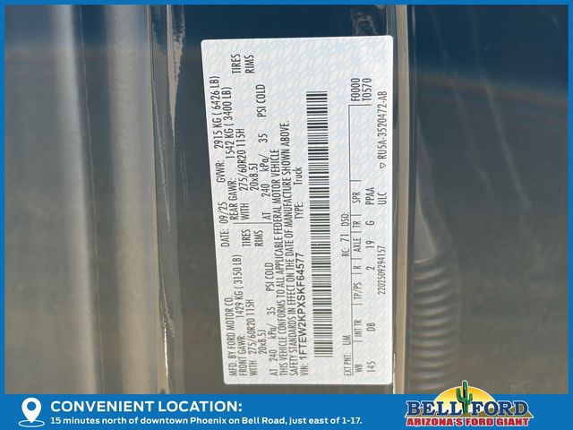 Equipment Group 200A Mid (LED Fog Lamps w/LED Cornering Lamp and Wheels: 20" Dark Gray w/Machined Aluminum), GVWR: 6,426 lbs Payload Package, 3.55 Axle Ratio, 4-Wheel Disc Brakes, 6 Speakers, ABS brakes, Air Conditioning, Alloy wheels, AM/FM radio: SiriusXM with 360L, Auto High-beam Headlights, Brake assist, Bumpers: body-color, Compass, Delay-off headlights, Driver door bin, Dual front impact airbags, Dual front side impact airbags, Electronic Stability Control, Emergency communication system: SYNC 4 911 Assist, Front anti-roll bar, Front Bucket Seats, Front Center Armrest, Front reading lights, Front wheel independent suspension, Fully automatic headlights, Heated door mirrors, Illuminated entry, Low tire pressure warning, Occupant sensing airbag, Outside temperature display, Overhead airbag, Overhead console, Panic alarm, Passenger door bin, Passenger vanity mirror, Power door mirrors, Power steering, Power windows, Radio data system, Radio: AM/FM Stereo w/SiriusXM 360L, Rear Parking Sensors, Rear step bumper, Rear window defroster, Remote keyless entry, Security system, Speed control, Split folding rear seat, Steering wheel mounted audio controls, SYNC 4 w/Enhanced Voice Recognition, Tachometer, Telescoping steering wheel, Tilt steering wheel, Traction control, Trip computer, Variably intermittent wipers, Voltmeter, and Wheels: 18" Gloss Black. Price includes: $1250 - Retail Bonus Cash. Exp. 01/05/2026