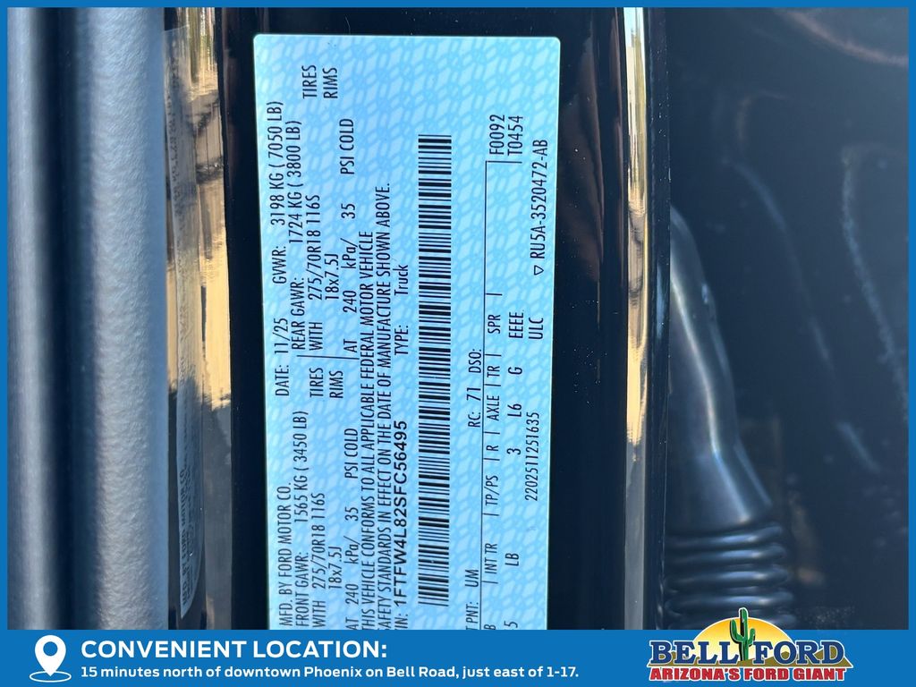 This Ford F-150 is equipped with the following options: Bed Utility Package (4 Pickup Box Tie-Down Plates, LED Box Lighting, and Power Tailgate), Equipment Group 401A Standard, GVWR: 7,100 lbs Payload Package, Mobile Office Package (Console Worksurface, Partitioned Lockable Rear Storage, and Wireless Charging), Tow/Haul Package (Integrated Trailer Brake Controller), 4WD, 4-Wheel Disc Brakes, 8 Speakers, ABS brakes, Adjustable pedals, Air Conditioning, Alloy wheels, AM/FM radio: SiriusXM with 360L, Auto High-beam Headlights, Auto-dimming door mirrors, Auto-dimming Rear-View mirror, Automatic temperature control, Brake assist, Bumpers: body-color, Compass, Delay-off headlights, Driver door bin, Driver vanity mirror, Dual front impact airbags, Dual front side impact airbags, Electronic Locking w/3.73 Axle Ratio, Electronic Stability Control, Emergency communication system: SYNC 4 911 Assist, First Aid Kit w/Ford Logo, Front anti-roll bar, Front Bucket Seats, Front Center Armrest, Front dual zone A/C, Front fog lights, Front reading lights, Front wheel independent suspension, Fully automatic headlights, Heated door mirrors, Heated front seats, Illuminated entry, Internet access capable: FordPass Connect 5G, Low tire pressure warning, Navigation system: Connected Navigation, Occupant sensing airbag, Outside temperature display, Overhead airbag, Overhead console, Panic alarm, Passenger door bin, Passenger vanity mirror, Power door mirrors, Power driver seat, Power passenger seat, Power steering, Power windows, Radio data system, Radio: B&O Sound System by Bang & Olufsen, Rear reading lights, Rear step bumper, Rear window defroster, Remote keyless entry, Security system, Speed control, Split folding rear seat, Steering wheel mounted audio controls, SYNC 4 w/Enhanced Voice Recognition, Tachometer, Tailgate Step w/Tailgate Work Surface, Telescoping steering wheel, Tilt steering wheel, Traction control, Trip computer, Turn signal indicator mirrors, Unique Sport Cloth 40/Console/40 Power Front Seat, Variably intermittent wipers, Voltmeter, and Wheels: 18" Alloy w/Dark Matte Finish. Price includes: $1000 - Final Days Mega Bonus Cash. Exp. 01/02/2026 $2000 - Retail Customer Cash. Exp. 01/05/2026