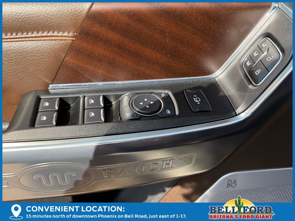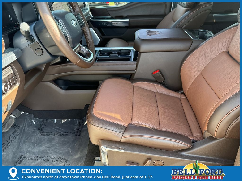 This Ford F-350SD is equipped with the following options: 5th Wheel/Gooseneck Hitch Prep Package, Chrome Package, FX4 Off-Road Package (Hill Descent Control, Off-Road Specifically Tuned Shock Absorbers, and Unique FX4 Off-Road Box Decal), Order Code 710A (Flow-Through Console, Radio: B&O Unleashed Sound System by Bang & Olufsen, SiriusXM Radio with 360L, SYNC 4 with Enhanced Voice Recognition, Unique King Ranch Leather 40/Console/40 Seats, and Wheels: 20" Bright Machined Cast Aluminum), 4WD, 14 Speakers, 4-Wheel Disc Brakes, ABS brakes, Adjustable pedals, Air Conditioning, Alloy wheels, AM/FM radio: SiriusXM with 360L, Auto High-beam Headlights, Auto tilt-away steering wheel, Auto-dimming Rear-View mirror, Automatic temperature control, Brake assist, Compass, Delay-off headlights, Driver door bin, Driver vanity mirror, Dual front impact airbags, Dual front side impact airbags, Electronic Stability Control, Emergency communication system: SYNC 4 911 Assist, Engine Block Heater, Front and Rear Wheel Well Liners, Front anti-roll bar, Front Bucket Seats, Front Center Armrest, Front dual zone A/C, Front fog lights, Front reading lights, Fully automatic headlights, Garage door transmitter, Heads-Up Display, Heated door mirrors, Heated front seats, Heated rear seats, Heated steering wheel, Illuminated entry, Internet access capable: FordPass Connect 5G, Leather steering wheel, Low tire pressure warning, Max Recline Seats, Memory seat, Navigation System, Outside temperature display, Overhead airbag, Overhead console, Panic alarm, Passenger door bin, Passenger vanity mirror, Pedal memory, Power door mirrors, Power driver seat, Power passenger seat, Power steering, Power windows, Rain sensing wipers, Rear reading lights, Rear seat center armrest, Rear step bumper, Rear window defroster, Remote keyless entry, Retractable Bed Side-Step, Security system, Speed control, Split folding rear seat, Steering wheel memory, Steering wheel mounted A/C controls, Steering wheel mounted audio controls, Tachometer, Telescoping steering wheel, Tilt steering wheel, Traction control, Trip computer, Turn signal indicator mirrors, Upfitter Switches (6), Variably intermittent wipers, and Ventilated front seats.