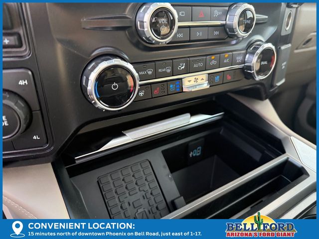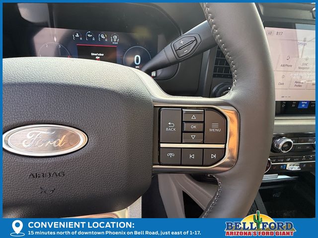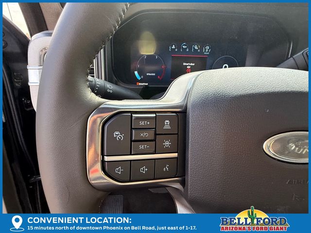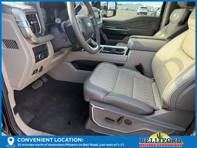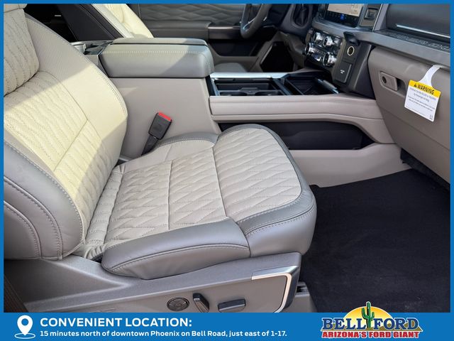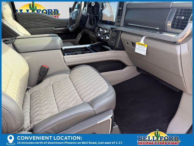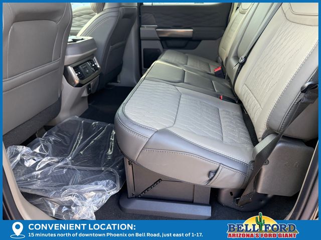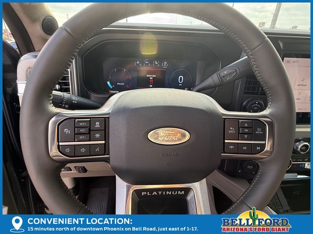 FX4 Off-Road Package (Hill Descent Control, Off-Road Specifically Tuned Shock Absorbers, and Unique FX4 Off-Road Box Decal), Order Code 713A, Platinum Plus Package (Illuminated Scuff Plates, Premium Leather IP Topper, Premium Luxury Leather-Wrapped Steering Wheel, Premium Venetian Leather Door Panel, Pro Power Onboard - 2kW, Satin Chrome Door Handles, Twin Panel Power Moonroof, Unique Platinum Plus Luxury Lthr 40/Console/40 Seats, Unique Satin Finish Grille, Unique Split Center Console Armrest, Upfitter Switches (6), and Wheels: 20" Bright w/Dark Carbonized Gray Aluminum), 4WD, 14 Speakers, 4-Wheel Disc Brakes, 410 Amp Dual Alternators, ABS brakes, Adjustable pedals, Air Conditioning, Alloy wheels, AM/FM radio: SiriusXM with 360L, Auto High-beam Headlights, Auto tilt-away steering wheel, Auto-dimming Rear-View mirror, Automatic temperature control, Brake assist, Bumpers: body-color, Compass, Delay-off headlights, Driver door bin, Driver vanity mirror, Dual front impact airbags, Dual front side impact airbags, Electronic Stability Control, Emergency communication system: SYNC 4 911 Assist, Flow-Through Console, Front anti-roll bar, Front Bucket Seats, Front Center Armrest, Front dual zone A/C, Front fog lights, Front reading lights, Fully automatic headlights, Garage door transmitter, Heads-Up Display, Heated door mirrors, Heated front seats, Heated rear seats, Heated steering wheel, Illuminated entry, Leather steering wheel, Low tire pressure warning, Memory seat, Navigation System, Outside temperature display, Overhead airbag, Overhead console, Panic alarm, Passenger door bin, Passenger vanity mirror, Pedal memory, Power door mirrors, Power driver seat, Power passenger seat, Power steering, Power windows, Radio: B&O Unleashed Sound System by Bang & Olufsen, Rain sensing wipers, Rapid-Heat Supplemental Cab Heater, Rear reading lights, Rear seat center armrest, Rear step bumper, Rear window defroster, Remote keyless entry, Retractable Bed Side-Step (Pre-Installed), Security system, SiriusXM Radio w/360L, Speed control, Split folding rear seat, Steering wheel memory, Steering wheel mounted A/C controls, Steering wheel mounted audio controls, SYNC 4 w/Enhanced Voice Recognition, Tachometer, Telescoping steering wheel, Tilt steering wheel, Tough Bed Spray-In Bedliner, Traction control, Trip computer, Turn signal indicator mirrors, Unique Platinum Leather 40/Console/40 Seats, Variably intermittent wipers, Vehicle Safe by Console Vault (Pre-Installed), Ventilated front seats, and Wheels: 20" Bright Machined & Painted Aluminum.