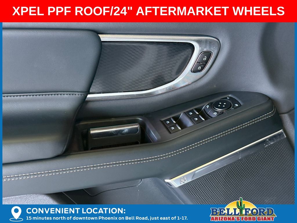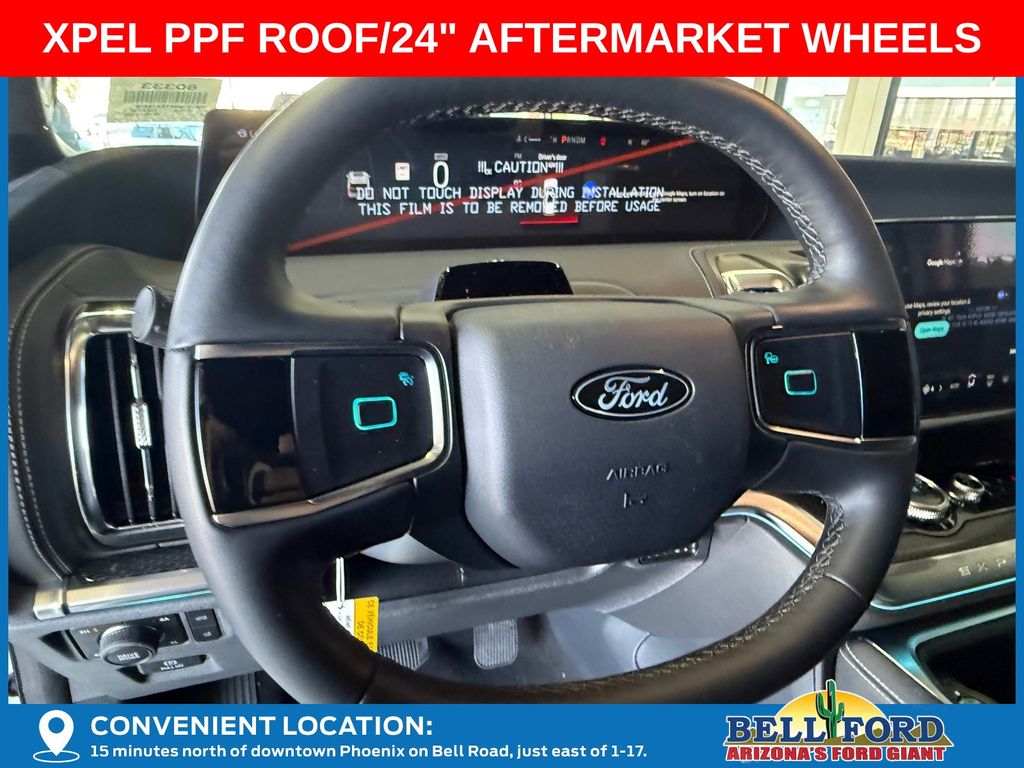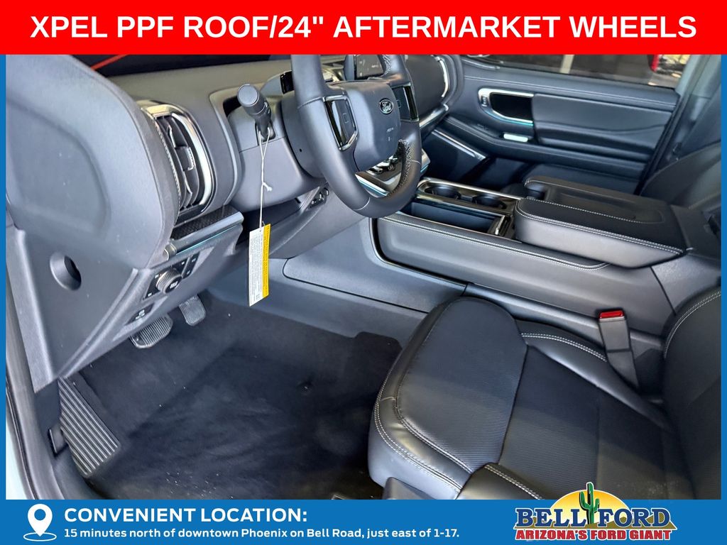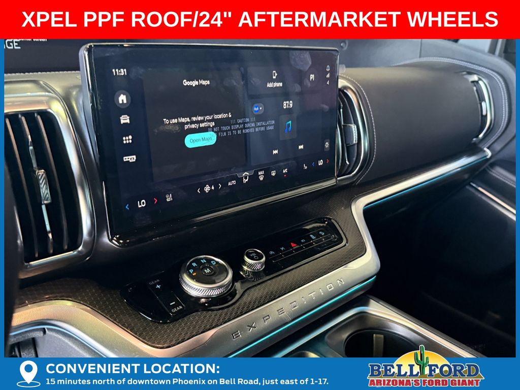 This Ford Expedition is equipped with the following options: Equipment Group 600A Standard Package (2nd Row Power-Folding Captain's Chairs, 3.73 Axle Ratio, BlueCruise Equipped (90-Day Trial), Ford Digital Experience, Heated and Ventilated Leather Front Captain's Chairs, Power Tilt/Telescopic Steering Wheel with Memory, Radio: B&O Sound System by Bang and Olufsen, SiriusXM with 360L, and Wheels: 20" x 8.5" Ebony Bright Machined Aluminum), Ford Connectivity Package (1-Year Included), Stealth Appearance Package (Black Belt Molding, Black Expedition Lettering on Hood, Black Headlamp Bezel with Ebony Trim Applique, Black Platinum Badge on Tailgate, Black Roof Rails, Carbon Black Front Bumper/Fascia, Rear Side Windows Laminated Glass, and Signature Grille Lighting), 4WD, 10 Speakers, 3rd row seats: split-bench, 4-Wheel Disc Brakes, ABS brakes, Air Conditioning, Alloy wheels, AM/FM radio: SiriusXM with 360L, Apple CarPlay/Android Auto, Auto High-beam Headlights, Auto-dimming door mirrors, Auto-dimming Rear-View mirror, Automatic temperature control, Brake assist, Bumpers: body-color, Compass, Delay-off headlights, Driver door bin, Driver vanity mirror, Dual front impact airbags, Dual front side impact airbags, Electronic Stability Control, Emergency communication system: 911 Assist, Exterior Parking Camera Rear, Four wheel independent suspension, Front anti-roll bar, Front Bucket Seats, Front Center Armrest, Front dual zone A/C, Front reading lights, Fully automatic headlights, Garage door transmitter, Genuine wood dashboard insert, Genuine wood door panel insert, Heated door mirrors, Heated front seats, Heated rear seats, Heated steering wheel, Illuminated entry, Intersection Assist, Leather steering wheel, Low tire pressure warning, Memory seat, Navigation System, Occupant sensing airbag, Outside temperature display, Overhead airbag, Overhead console, Panic alarm, Passenger door bin, Passenger vanity mirror, Power door mirrors, Power driver seat, Power moonroof: Vista Roof, Power passenger seat, Power steering, Power windows, Radio data system, Rain sensing wipers, Rear air conditioning, Rear anti-roll bar, Rear reading lights, Rear window defroster, Rear window wiper, Reclining 3rd row seat, Remote keyless entry, Security system, Speed control, Speed-sensing steering, Speed-Sensitive Wipers, Split folding rear seat, Spoiler, Steering wheel memory, Steering wheel mounted audio controls, Tachometer, Telescoping steering wheel, Tilt steering wheel, Traction control, Trip computer, Turn signal indicator mirrors, Variably intermittent wipers, Ventilated front seats, and Voltmeter. Price includes dealer added accessories totaling $8,980.