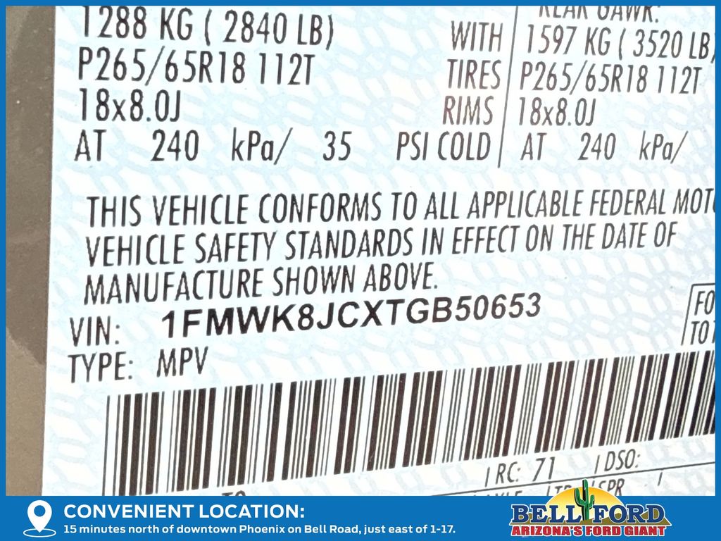 - VIN : 1FMWK8JCXTGB50653