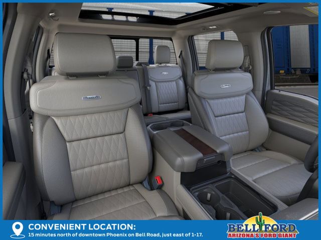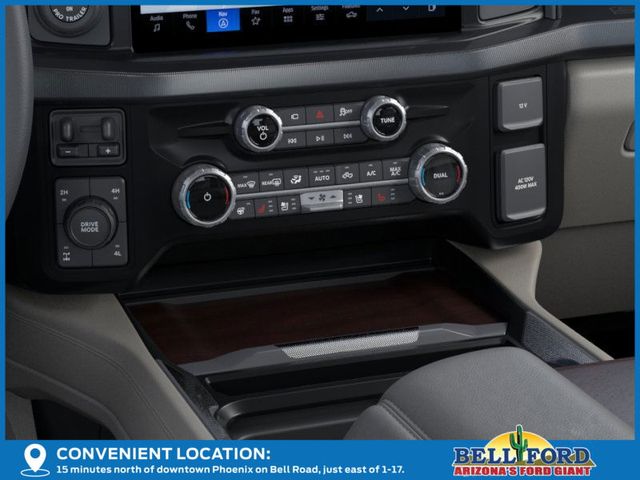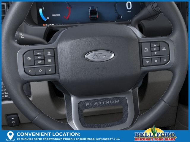 5th Wheel/Gooseneck Hitch Prep Package, Ford Connectivity Package (1-Year Included), FX4 Off-Road Package (Hill Descent Control, Off-Road Specifically Tuned Shock Absorbers, and Unique FX4 Off-Road Box Decal), Internet access capable: 5G Modem - Ford Connectivity Package, Order Code 713A, Platinum Plus Package (Illuminated Scuff Plates, Premium Leather IP Topper, Premium Luxury Leather-Wrapped Steering Wheel, Premium Venetian Leather Door Panel, Pro Power Onboard - 2kW, Satin Chrome Door Handles, Twin Panel Power Moonroof, Unique Platinum Plus Luxury Lthr 40/Console/40 Seats, Unique Satin Finish Grille, Unique Split Center Console Armrest, Upfitter Switches (6), and Wheels: 20" Bright Machined Aluminum), 4WD, 14 Speakers, 4-Wheel Disc Brakes, ABS brakes, Adjustable pedals, Air Conditioning, Alloy wheels, AM/FM radio: SiriusXM with 360L, Auto High-beam Headlights, Auto tilt-away steering wheel, Auto-dimming Rear-View mirror, Automatic temperature control, Brake assist, Bumpers: body-color, Compass, Delay-off headlights, Driver door bin, Driver vanity mirror, Dual front impact airbags, Dual front side impact airbags, Electronic Stability Control, Emergency communication system: SYNC 4 911 Assist, Flow-Through Console, Front & Rear Wheel Well Liners (Pre-Installed), Front anti-roll bar, Front Bucket Seats, Front Center Armrest, Front dual zone A/C, Front fog lights, Front reading lights, Fully automatic headlights, Garage door transmitter, Heads-Up Display, Heated door mirrors, Heated front seats, Heated rear seats, Heated steering wheel, Illuminated entry, Leather steering wheel, Low tire pressure warning, Memory seat, Navigation system: Connected Navigation, Outside temperature display, Overhead airbag, Overhead console, Panic alarm, Passenger door bin, Passenger vanity mirror, Pedal memory, Power door mirrors, Power driver seat, Power passenger seat, Power steering, Power windows, Radio: B&O Unleashed Sound System by Bang & Olufsen, Rain sensing wipers, Rear reading lights, Rear seat center armrest, Rear step bumper, Rear window defroster, Remote keyless entry, Security system, SiriusXM w/360L, Speed control, Split folding rear seat, Steering wheel memory, Steering wheel mounted A/C controls, Steering wheel mounted audio controls, SYNC 4 w/Enhanced Voice Recognition, Tachometer, Telescoping steering wheel, Tilt steering wheel, Tough Bed Spray-In Bedliner, Traction control, Trip computer, Turn signal indicator mirrors, Unique Platinum Leather 40/Console/40 Seats, Variably intermittent wipers, Ventilated front seats, and Wheels: 20" Bright Machined & Painted Aluminum.
