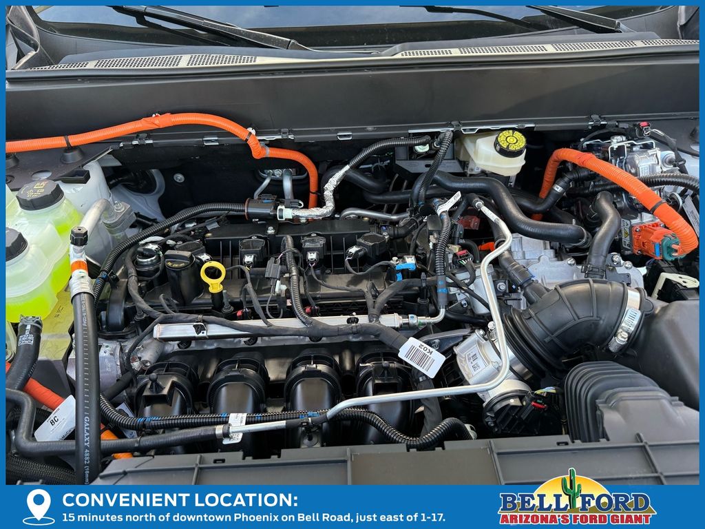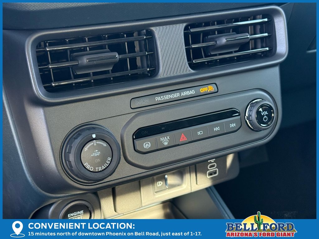 This Ford Maverick is equipped with the following options: 4K Tow Package (Trailer Brake Controller, Trailer Hitch (class III) 2" Receiver, and Upgraded Cooling Fan), Black Appearance Package (Black Grille, Black Interior Accents, and Wheels: 19" Black Painted Aluminum), Equipment Group 501A (2.91 Axle Ratio, ActiveX Trimmed Heated Front Bucket Seats, Radio: B&O Sound System by Bang and Olufsen, SiriusXM with 360L, SYNC 4 with Enhanced Voice Recognition, and Wheels: 19" Machined Aluminum Painted), Ford Connectivity Package (1-Year Included), Internet access capable: 5G Modem - Ford Connectivity Package, 2.5L I-4 Hybrid, 4-Wheel Disc Brakes, 8 Speakers, ABS brakes, Air Conditioning, Alloy wheels, AM/FM radio: SiriusXM with 360L, Apple CarPlay/Android Auto, Auto High-beam Headlights, Automatic temperature control, Brake assist, Bumpers: body-color, Compass, Delay-off headlights, Driver door bin, Driver vanity mirror, Dual front impact airbags, Dual front side impact airbags, Electronic Stability Control, Emergency communication system: SYNC 4 911 Assist, Exterior Parking Camera Rear, Four wheel independent suspension, Front anti-roll bar, Front Bucket Seats, Front Center Armrest, Front dual zone A/C, Front reading lights, Fully automatic headlights, Heated door mirrors, Heated front seats, Heated steering wheel, Illuminated entry, Knee airbag, Low tire pressure warning, Navigation system: Connected Navigation, Occupant sensing airbag, Outside temperature display, Overhead airbag, Overhead console, Panic alarm, Passenger door bin, Passenger vanity mirror, Power door mirrors, Power driver seat, Power steering, Power windows, Power-Sliding Rear Window, Radio data system, Rear anti-roll bar, Rear seat center armrest, Rear step bumper, Remote keyless entry, Security system, Speed control, Speed-sensing steering, Steering wheel mounted audio controls, Telescoping steering wheel, Tilt steering wheel, Traction control, and Trip computer.