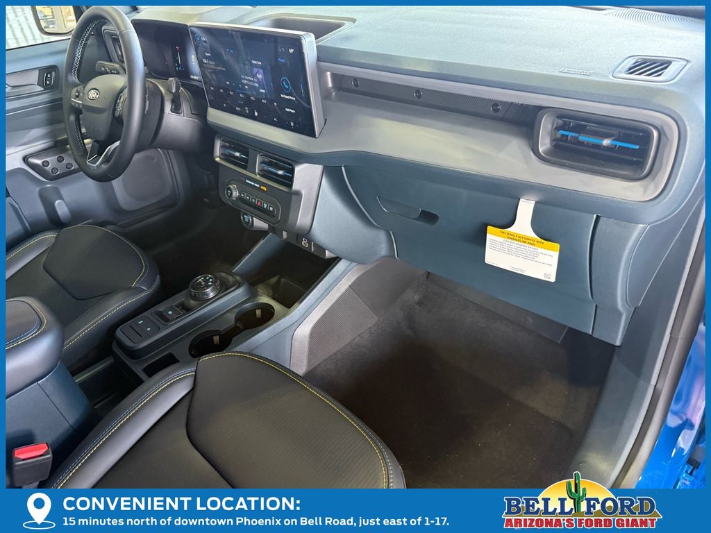 This Ford Maverick is equipped with the following options: Equipment Group 402A Standard (3.63 Axle Ratio, ActiveX Trimmed Front Bucket Seats, Radio: AM/FM Stereo with 6 Speakers, SiriusXM with 360L, SYNC 4 with Enhanced Voice Recognition, and Wheels: 19" Turbofan-Stuled Black Painted Aluminum), Ford Connectivity Package (1-Year Included), Internet access capable: 5G Modem - Ford Connectivity Package, 4-Wheel Disc Brakes, 6 Speakers, ABS brakes, Air Conditioning, Alloy wheels, AM/FM radio: SiriusXM with 360L, Apple CarPlay/Android Auto, Auto High-beam Headlights, Automatic temperature control, Brake assist, Bumpers: body-color, Compass, Delay-off headlights, Driver door bin, Driver vanity mirror, Dual front impact airbags, Dual front side impact airbags, Electronic Stability Control, Emergency communication system: SYNC 4 911 Assist, Exterior Parking Camera Rear, Four wheel independent suspension, Front anti-roll bar, Front Bucket Seats, Front Center Armrest, Front fog lights, Front reading lights, Fully automatic headlights, Illuminated entry, Knee airbag, Low tire pressure warning, Occupant sensing airbag, Outside temperature display, Overhead airbag, Overhead console, Panic alarm, Passenger door bin, Passenger vanity mirror, Power door mirrors, Power driver seat, Power steering, Power windows, Radio data system, Rear anti-roll bar, Rear Parking Sensors, Rear seat center armrest, Rear step bumper, Remote keyless entry, Security system, Speed control, Speed-sensing steering, Steering wheel mounted audio controls, Tachometer, Telescoping steering wheel, Tilt steering wheel, Traction control, Trip computer, and Wheels: 19" Black Painted Aluminum.