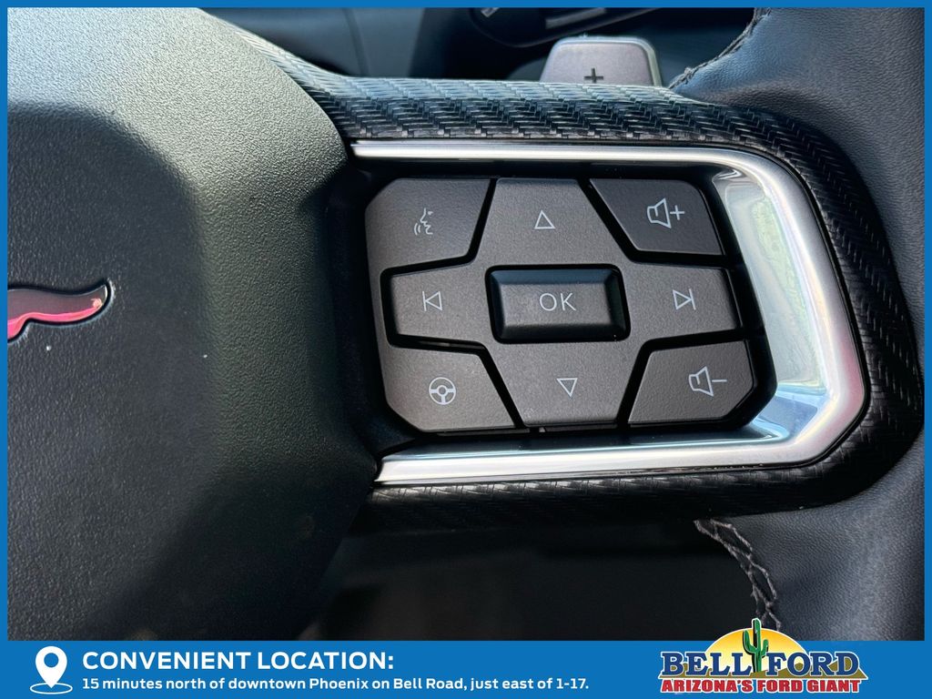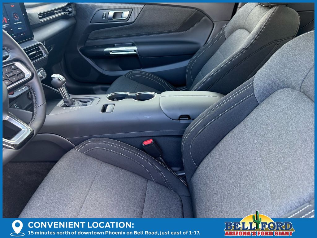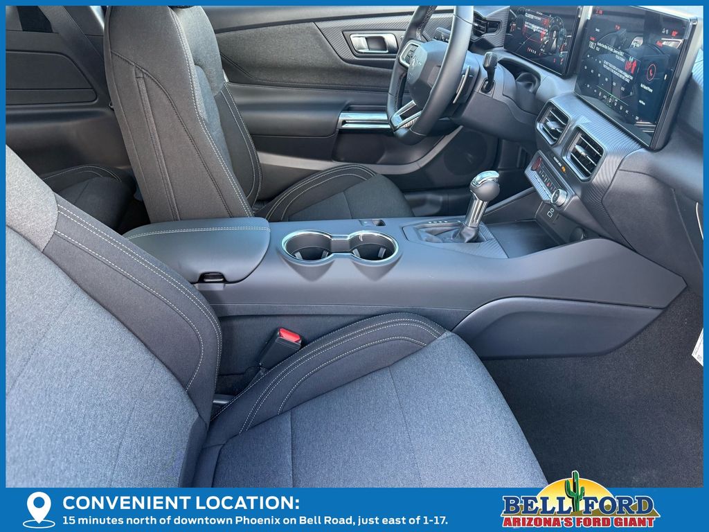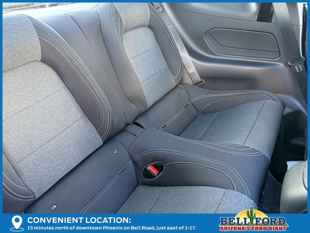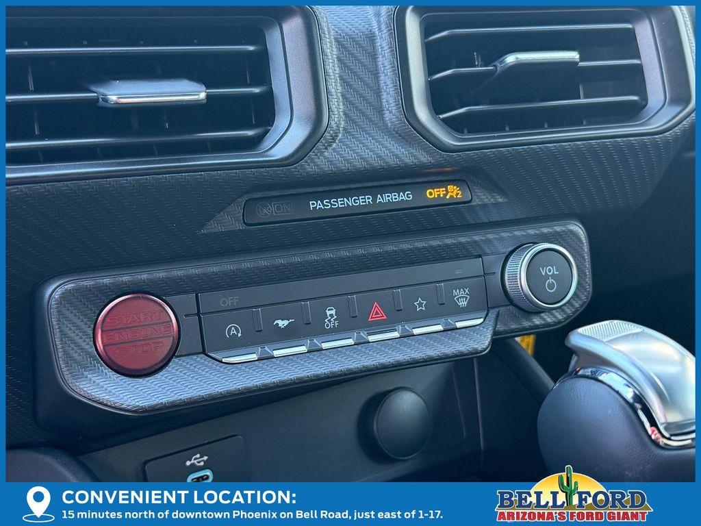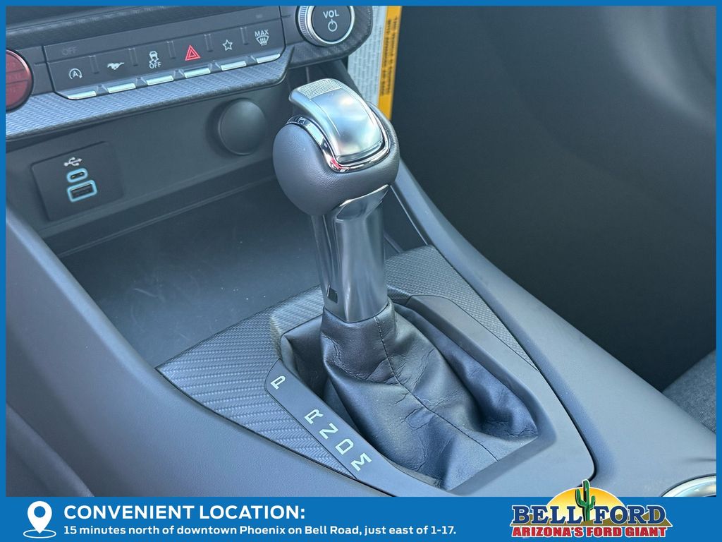 This Ford Mustang is equipped with the following options: Equipment Group 300A Standard Package, 1st Row Carpeted Black Floor Mats, 4-Wheel Disc Brakes, 6 Speakers, ABS brakes, Active Valve Performance Exhaust, Air Conditioning, Alloy wheels, AM/FM radio, AM/FM Stereo, Auto High-beam Headlights, Automatic temperature control, Brake assist, Bumpers: body-color, Cloth Bucket Seats, Compass, Delay-off headlights, Driver door bin, Driver vanity mirror, Dual front impact airbags, Dual front side impact airbags, Electronic Stability Control, Emergency communication system: 911 Assist, Exterior Parking Camera Rear, Four wheel independent suspension, Front anti-roll bar, Front Bucket Seats, Front Center Armrest, Front dual zone A/C, Front reading lights, Fully automatic headlights, Illuminated entry, Internet access capable: FordPass Connect, Knee airbag, Leather Shift Knob, Leather steering wheel, Low tire pressure warning, Occupant sensing airbag, Outside temperature display, Overhead airbag, Overhead console, Panic alarm, Passenger door bin, Passenger vanity mirror, Power door mirrors, Power steering, Power windows, Radio data system, Rain sensing wipers, Rear anti-roll bar, Rear Parking Sensors, Rear window defroster, Remote keyless entry, Speed control, Speed-sensing steering, Speed-Sensitive Wipers, Split folding rear seat, Sport steering wheel, Steering wheel mounted audio controls, SYNC 4, Tachometer, Telescoping steering wheel, Tilt steering wheel, Traction control, Trip computer, Variably intermittent wipers, Voltmeter, and Wheels: 18" x 8.5" Ebony Black Painted Aluminum.