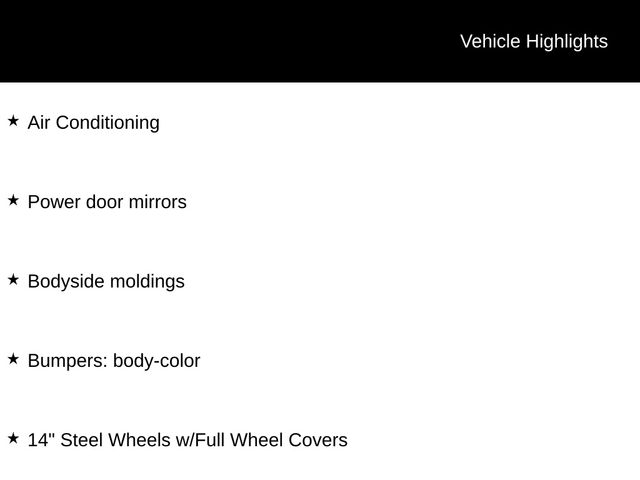 14" Steel Wheels w/Full Wheel Covers, Air Conditioning, AM/FM/CD w/4 Speakers, Bodyside moldings, Bumpers: body-color, Power door mirrors.