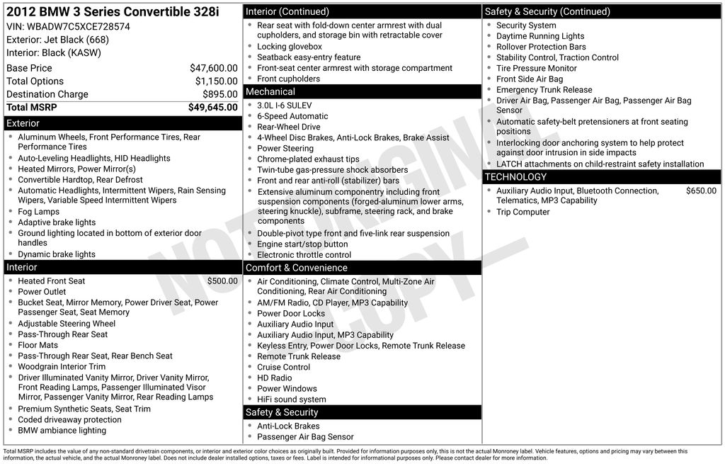 Jet Black 2012 BMW 3 Series 328i RWD 6-Speed Automatic Steptronic 3.0L 6-Cylinder DOHC 24V