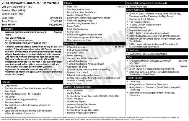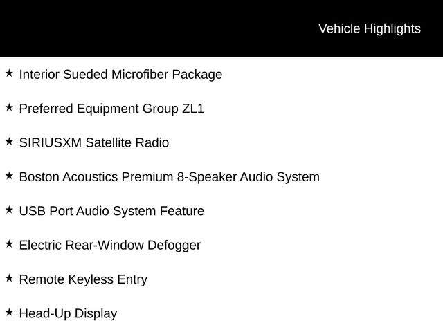 2 Front Cup Holders, 3-Spoke Leather-Wrapped Steering Wheel, Analog Instrumentation, Boston Acoustics Premium 8-Speaker Audio System, Carpeted Front Floor Mats, Electric Rear-Window Defogger, Electronic Cruise Control, Head-Up Display, Heated Driver & Front Passenger Seats, High-Intensity Discharge Headlamps, Interior Sueded Microfiber Package, LATCH System, Leather-Wrapped Shift Knob, Maintenance-Free Battery, Manual Rake & Telescopic Steering Column, OnStar 6 Months Directions & Connections Plan, Power Programmable Door Locks, Preferred Equipment Group ZL1, Remote Keyless Entry, SIRIUSXM Satellite Radio, StabiliTrak, Steering Wheel Mounted Audio Controls, Sueded Microfiber-Wrapped 3-Spoke Steering Wheel, Sueded Microfiber-Wrapped Shift Knob, Tonneau Cover, Ultrasonic Rear Park Assist, Universal Home Remote, USB Port Audio System Feature.