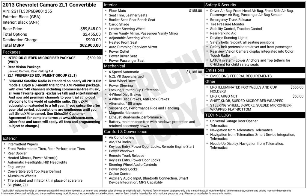 2 Front Cup Holders, 3-Spoke Leather-Wrapped Steering Wheel, Analog Instrumentation, Boston Acoustics Premium 8-Speaker Audio System, Carpeted Front Floor Mats, Electric Rear-Window Defogger, Electronic Cruise Control, Head-Up Display, Heated Driver & Front Passenger Seats, High-Intensity Discharge Headlamps, Interior Sueded Microfiber Package, LATCH System, Leather-Wrapped Shift Knob, Maintenance-Free Battery, Manual Rake & Telescopic Steering Column, OnStar 6 Months Directions & Connections Plan, Power Programmable Door Locks, Preferred Equipment Group ZL1, Remote Keyless Entry, SIRIUSXM Satellite Radio, StabiliTrak, Steering Wheel Mounted Audio Controls, Sueded Microfiber-Wrapped 3-Spoke Steering Wheel, Sueded Microfiber-Wrapped Shift Knob, Tonneau Cover, Ultrasonic Rear Park Assist, Universal Home Remote, USB Port Audio System Feature.