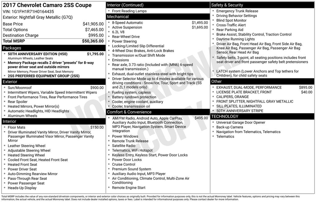 ** HERE AT BELL FORD ITS ALL ABOUT THE EXPERIENCE** Please visit us online at www.bellford.com This Chevrolet Camaro is equipped with the following options: Preferred Equipment Group 2SS, 2 USB Ports & Auxiliary Input Jack, 2.77 Rear Axle Ratio, 4-Wheel Disc Brakes, 50th Anniversary Edition, 50th Anniversary Stripe, 9 Speakers, ABS brakes, Air Conditioning, All-Weather Floor Mats, Alloy wheels, AM/FM radio: SiriusXM, Apple CarPlay/Android Auto, Auto-dimming door mirrors, Auto-dimming Rear-View mirror, Automatic temperature control, Bose Premium 9-Speaker Audio System Feature, Brake assist, Bumpers: body-color, Compass, Delay-off headlights, Driver door bin, Driver vanity mirror, Dual front impact airbags, Dual front side impact airbags, Dual Mode Performance Exhaust, Electronic Stability Control, Emergency communication system, Exterior Parking Camera Rear, Four wheel independent suspension, Front anti-roll bar, Front Bucket Seats, Front Center Armrest, Front dual zone A/C, Front fog lights, Front License Plate Bracket, Front reading lights, Front Sport Bucket Seats, Fully automatic headlights, Garage door transmitter, Heads-Up Display, Heated door mirrors, Heated front seats, Heated steering wheel, High-Intensity Discharge Headlights, Illuminated entry, Illuminated Sill Plates (BR9), Knee airbag, Leather Shift Knob, Leather-Trimmed Seat Trim, Low tire pressure warning, Magnetic Ride Control, Memory seat, Nightfall Gray Metallic Front Splitter, Occupant sensing airbag, Orange Calipers, Outside temperature display, Overhead airbag, Paddle-Shift Manual Controls, Panic alarm, Passenger door bin, Passenger vanity mirror, Power door mirrors, Power driver seat, Power passenger seat, Power steering, Power Sunroof, Power windows, Premium audio system: Chevrolet MyLink, Radio data system, Radio: Chevrolet MyLink Audio System, Radio: Chevrolet MyLink w/Navigation, Rear anti-roll bar, Rear window defroster, Remote keyless entry, Remote Vehicle Starter System, Security system, SiriusXM Satellite Radio, Speed control, Speed-sensing steering, Spoiler, Steering wheel mounted audio controls, Tachometer, Telescoping steering wheel, Tilt steering wheel, Traction control, Trip computer, Variably intermittent wipers, Ventilated front seats, Voltmeter, Wheels: 20" x 8.5" Fr & 20" x 9.5" Rr 5-Spoke Alum, and Wheels: 20" x 8.5" Fr & 20" x 9.5" Rr 50th AnniV.