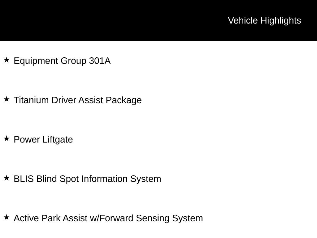 I4 Hybrid, Active Park Assist w/Forward Sensing System, BLIS Blind Spot Information System, Equipment Group 301A, Power Liftgate, Titanium Driver Assist Package.