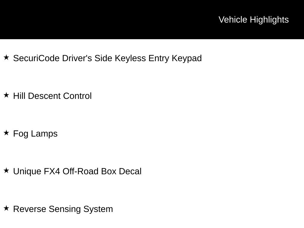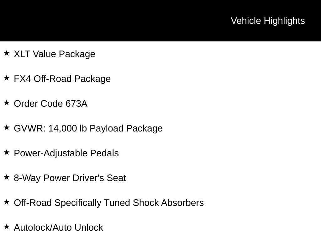 4WD, 8-Way Power Driver's Seat, Autolock/Auto Unlock, Fog Lamps, FX4 Off-Road Package, GVWR: 14,000 lb Payload Package, Hill Descent Control, Off-Road Specifically Tuned Shock Absorbers, Order Code 673A, Power-Adjustable Pedals, Reverse Sensing System, SecuriCode Driver's Side Keyless Entry Keypad, Unique FX4 Off-Road Box Decal, XLT Value Package.
