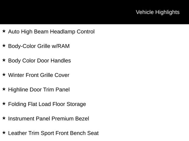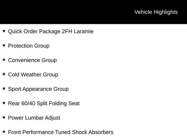 #1 Seat Foam Cushion, 40/20/40 Split Bench Seat, Auto High Beam Headlamp Control, Bi-Function Black Projector Headlamp, Black Painted Exterior Mirrors, Black Power Fold-Away Mirrors, Black Premium Tail Lamp, Body Color Door Handles, Body-Color Grille w/RAM, Cold Weather Group, Convenience Group, Engine Block Heater, Folding Flat Load Floor Storage, Front Armrest w/Cupholders, Front Center Seat Cushion Storage, Front Performance Tuned Shock Absorbers, High Back Seats, Highline Door Trim Panel, Instrument Panel Premium Bezel, Leather Trim Sport Front Bench Seat, Painted Front Bumper, Painted Rear Bumper, Power Lumbar Adjust, Protection Group, Quick Order Package 2FH Laramie, Rain Sensitive Windshield Wipers, Rear 60/40 Split Folding Seat, Rear Performance Tuned Shock Absorbers, Sport Appearance Group, Storage Tray, Ventilated Front Seats, Winter Front Grille Cover.