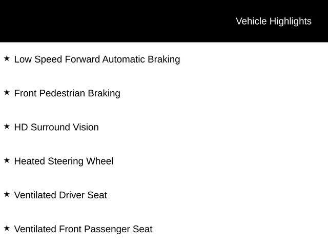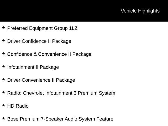 8-Way Power Front Passenger Seat Adjuster, Adaptive Cruise Control - Camera, Bose Premium 7-Speaker Audio System Feature, Confidence & Convenience II Package, Driver Confidence II Package, Driver Convenience II Package, Following Distance Indicator, Forward Collision Alert, Front Pedestrian Braking, HD Radio, HD Surround Vision, Heated Rear Seats, Heated Steering Wheel, Infotainment II Package, IntelliBeam Auto High Beam Headlamp Control, Lane Keep Assist w/Lane Departure Warning, Low Speed Forward Automatic Braking, Preferred Equipment Group 1LZ, Radio: Chevrolet Infotainment 3 Premium System, Safety Alert Seat, Ventilated Driver Seat, Ventilated Front Passenger Seat.