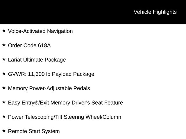 4WD, Ambient Lighting - Fixed Color, Automatic High Beam, Easy Entry/Exit Memory Driver's Seat Feature, GVWR: 11,300 lb Payload Package, Intelligent Access w/Push-Button Start, Lariat Ultimate Package, LED Box Lighting, Memory Power-Adjustable Pedals, Order Code 618A, Power Heated/Cooled Driver Seat w/Memory, Power Heated/Cooled Passenger Seat, Power Telescoping/Tilt Steering Wheel/Column, PowerScope Trailer Tow Mirrors w/Memory, Remote Start System, Remote Tailgate Release, Tailgate Step & Handle, Voice-Activated Navigation.