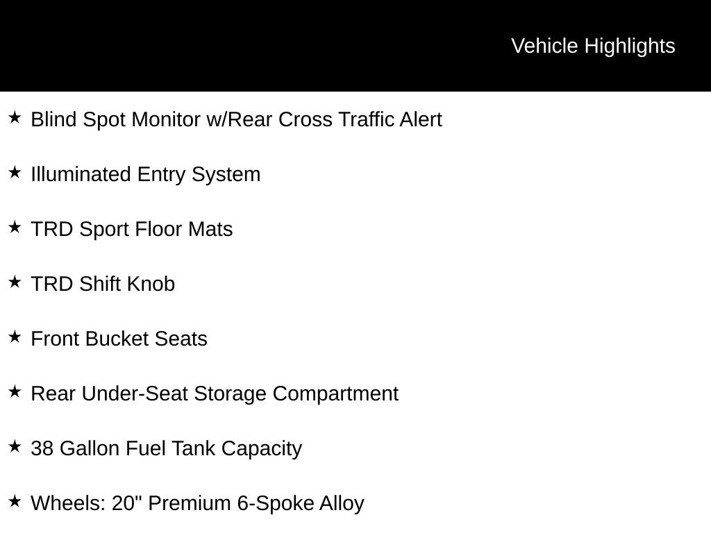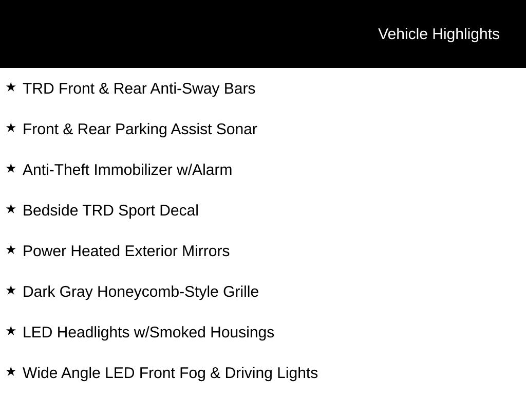 4WD, Graphite Cloth, 38 Gallon Fuel Tank Capacity, Anti-Theft Immobilizer w/Alarm, Bedside TRD Sport Decal, Blind Spot Monitor w/Rear Cross Traffic Alert, Dark Gray Honeycomb-Style Grille, Fabric Seat Trim w/TRD Off Road Package, Fabric Seat Trim w/TRD Sport Package, Front & Rear Parking Assist Sonar, Front Bucket Seats, Illuminated Entry System, LED Headlights w/Smoked Housings, Power Heated Exterior Mirrors, Power Sliding Rear Window w/Privacy Glass, Rear Under-Seat Storage Compartment, Sport-Tuned Suspension, SR5 Upgrade Package, TRD Front & Rear Anti-Sway Bars, TRD Shift Knob, TRD Sport Convenience Package, TRD Sport Floor Mats, TRD Sport Package, TRD-Tuned Bilstein Dampers, Urethane Tilt/Telescopic Steering Wheel, Wheels: 20" Premium 6-Spoke Alloy, Wide Angle LED Front Fog & Driving Lights.
