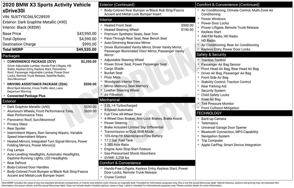 This 2020 BMW X3 xDrive30i is equipped with a suite of premium features that elevate the driving experience. Key highlights include: