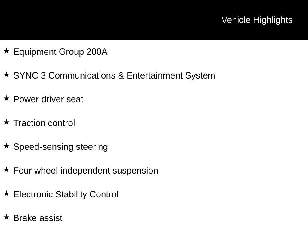 Brake assist, Electronic Stability Control, Equipment Group 200A, Exterior Parking Camera Rear, Four wheel independent suspension, Power driver seat, Speed control, Speed-sensing steering, SYNC 3 Communications & Entertainment System, Traction control, Wheels: 17" Shadow Silver-Painted Aluminum.