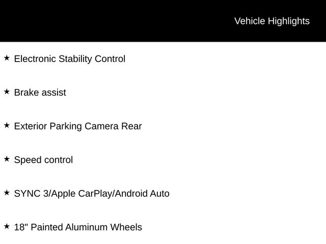 18" Painted Aluminum Wheels, Air Conditioning, Automatic temperature control, Brake assist, Electronic Stability Control, Equipment Group 100A, Exterior Parking Camera Rear, Four wheel independent suspension, Power Liftgate, Speed control, Speed-sensing steering, SYNC 3 Communications & Entertainment System, SYNC 3/Apple CarPlay/Android Auto, Traction control.