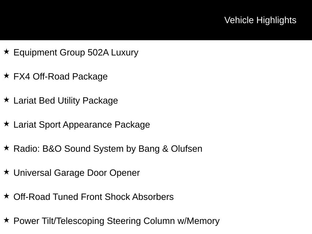 Step inside the cabin, and you'll be greeted by premium leather-trimmed seats, a heated steering wheel, and a state-of-the-art B&O sound system. The Lariat Bed Utility Package enhances the truck's versatility, while the Lariat Sport Appearance Package gives it a sleek, modern look.