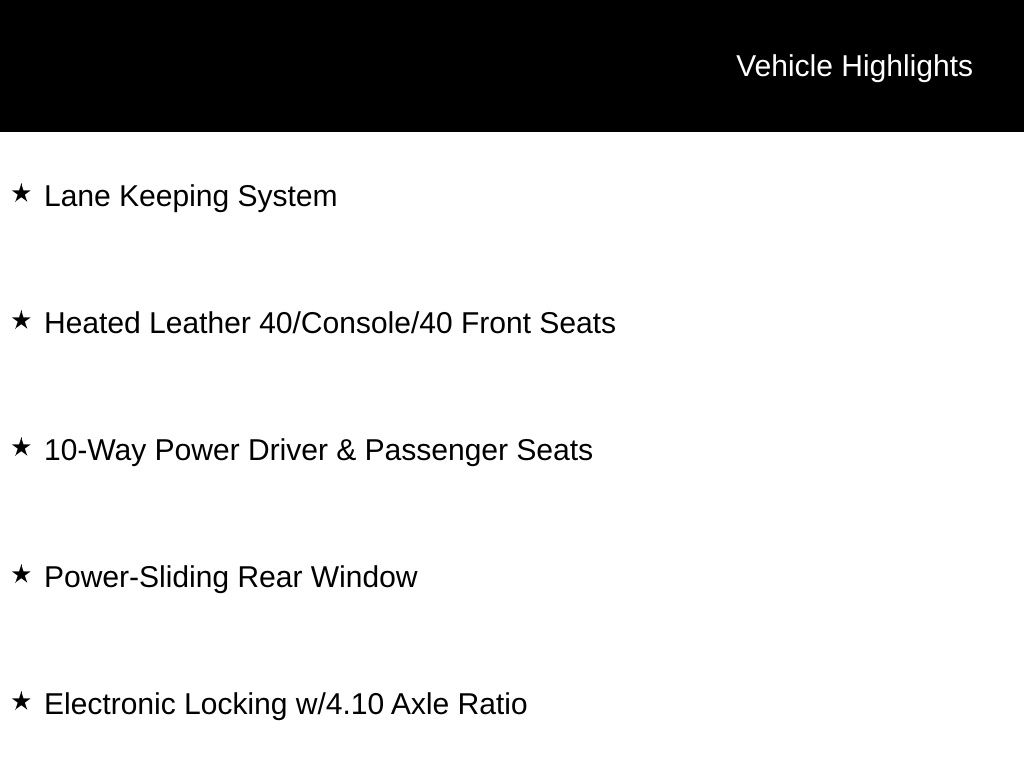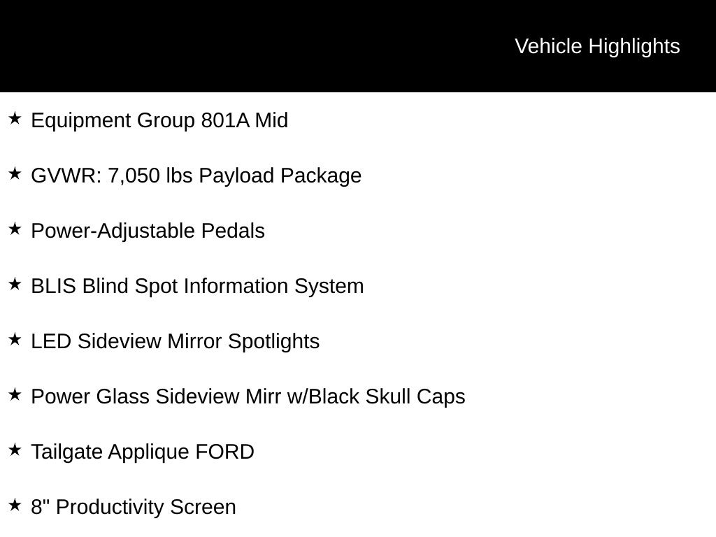 4WD, 10-Way Power Driver & Passenger Seats, 8" Productivity Screen, BLIS Blind Spot Information System, Electronic Locking w/4.10 Axle Ratio, Equipment Group 801A Mid, GVWR: 7,050 lbs Payload Package, Heated Leather 40/Console/40 Front Seats, Lane Keeping System, LED Sideview Mirror Spotlights, Power Glass Sideview Mirr w/Black Skull Caps, Power-Adjustable Pedals, Power-Sliding Rear Window, Tailgate Applique FORD.