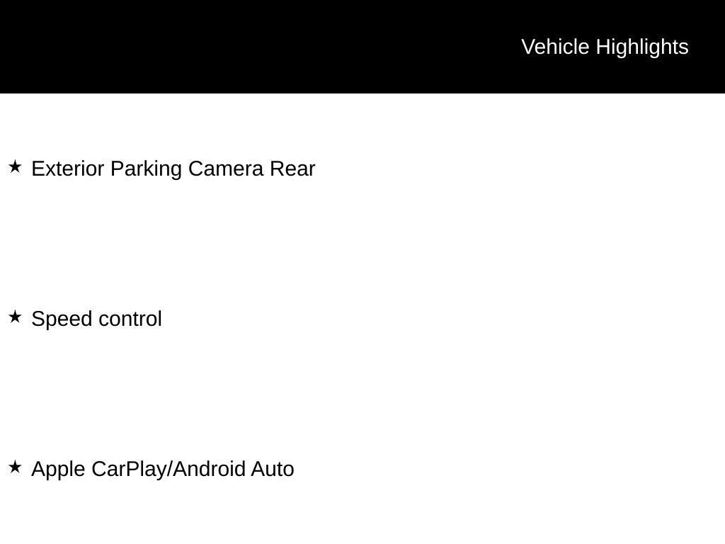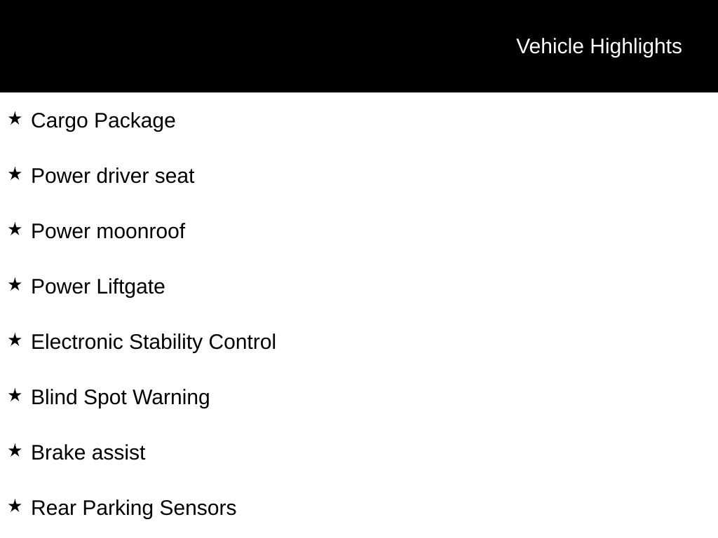Apple CarPlay/Android Auto, Blind Spot Warning, Brake assist, Cargo Package, Electronic Stability Control, Exterior Parking Camera Rear, Power driver seat, Power Liftgate, Power moonroof, Rear Parking Sensors, Speed control.