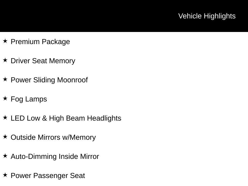 Premium Package: Includes Bose Audio, 2 speakers (1 center and 1 subwoofer), Driver Seat Memory, Power Sliding Moonroof, LED Low & High Beam Headlights, Auto-Dimming Inside Mirror, HomeLink universal transceiver, Power Passenger Seat, Fog Lamps, Outside Mirrors w/Memory