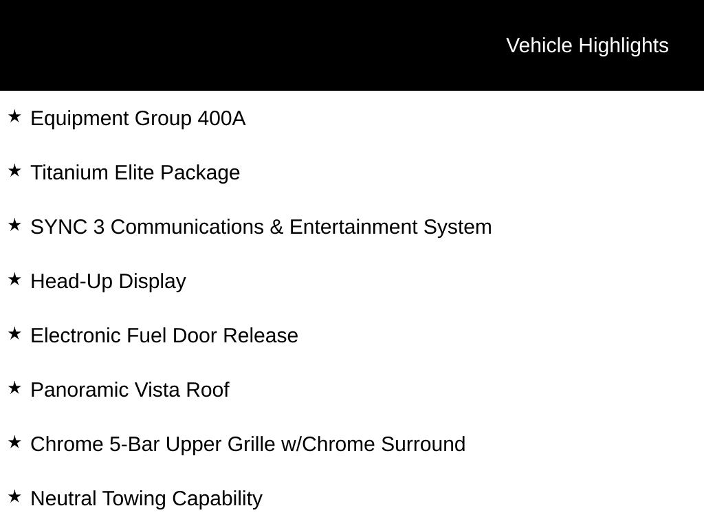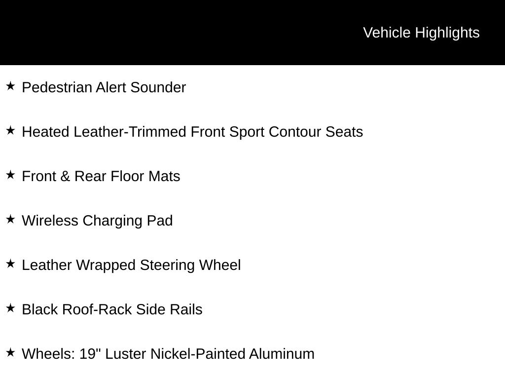 2.5L iVCT, eCVT, Black Roof-Rack Side Rails, Chrome 5-Bar Upper Grille w/Chrome Surround, Electronic Fuel Door Release, Equipment Group 400A, Front & Rear Floor Mats, Head-Up Display, Heated Leather-Trimmed Front Sport Contour Seats, Leather Wrapped Steering Wheel, Neutral Towing Capability, Panoramic Vista Roof, Pedestrian Alert Sounder, SYNC 3 Communications & Entertainment System, Titanium Elite Package, Wheels: 19" Luster Nickel-Painted Aluminum, Wireless Charging Pad.