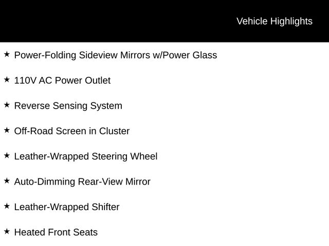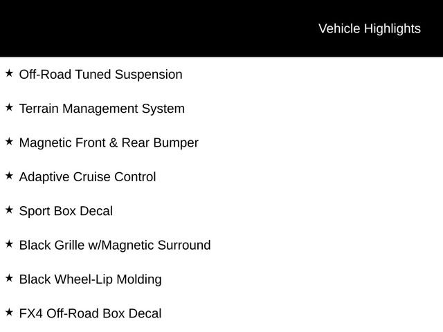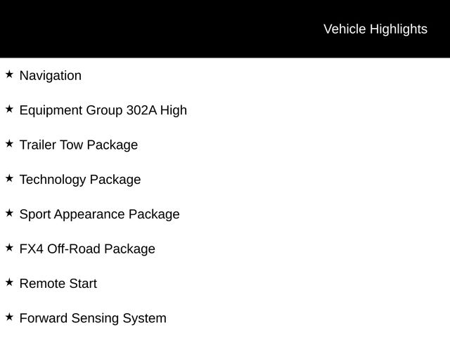 4WD, 110V AC Power Outlet, Adaptive Cruise Control, Auto-Dimming Rear-View Mirror, Black Grille w/Magnetic Surround, Black Wheel-Lip Molding, Class IV Trailer Hitch Receiver, Electronic-Locking Rear Differential, Equipment Group 302A High, Forward Sensing System, FX4 Off-Road Box Decal, FX4 Off-Road Package, Heated Front Seats, Leather-Wrapped Shifter, Leather-Wrapped Steering Wheel, Magnetic Front & Rear Bumper, Manual-Sliding Rear-Window, Navigation, Off-Road Screen in Cluster, Off-Road Tuned Suspension, Power-Folding Sideview Mirrors w/Power Glass, Remote Start, Reverse Sensing System, Sport Appearance Package, Sport Box Decal, Technology Package, Terrain Management System, Trailer Tow Package, Wheels: 17" Magnetic Painted Aluminum Sport.