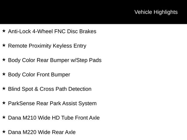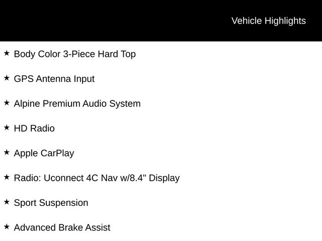 1-Year SiriusXM Guardian Trial, 3.73 Rear Axle Ratio, 4G LTE Wi-Fi Hot Spot, 5-Year SiriusXM Traffic Service, 5-Year SiriusXM Travel Link Service, 8.4" Radio & Premium Audio Group, 8.4" Touchscreen Display, Advanced Brake Assist, Advanced Safety Group, Alpine Premium Audio System, Anti-Lock 4-Wheel FNC Disc Brakes, Apple CarPlay, Auto High Beam Headlamp Control, Auto-Dimming Rear-View Mirror, Blind Spot & Cross Path Detection, Body Color 3-Piece Hard Top, Body Color Door Handles, Body Color Exterior Mirrors, Body Color Front Bumper, Body Color Fuel Filler Door, Body Color Grille w/Gloss Black Rings, Body Color Rear Bumper w/Step Pads, Caramel Interior Accents, Cold Weather Group, Dana M210 Wide HD Tube Front Axle, Dana M220 Wide Rear Axle, Daytime Running Lamps LED Accents, Emergency/Assistance Call, For Details, Visit DriveUconnect.com, For More Info, Call 800-643-2112, Front LED Fog Lamps, Full Body Color Fender Flares, Full Speed Forward Collision Warning Plus, Google Android Auto, GPS Antenna Input, GPS Navigation, HD Radio, Heated Front Seats, Heated Steering Wheel, High Altitude Package, Integrated Voice Command w/Bluetooth, Leather Trimmed Bucket Seats (KL), Leather Wrapped Park Brake Handle, Leather Wrapped Shift Knob, LED Lighting Group, LED Premium Reflector Headlamps, LED Taillamps, Off-Road Info Pages, ParkSense Rear Park Assist System, Premium Dark Exterior Accents, Quick Order Package 25N High Altitude, Radio: Uconnect 4C Nav w/8.4" Display, Remote Proximity Keyless Entry, Safety Group, SiriusXM Traffic Plus, SiriusXM Travel Link, Sport Suspension, Summit Badging, USB Host Flip, Wheels: 20" x 8" Fully Painted Aluminum, Wrapped I/P Bezel w/Caramel Stitch.