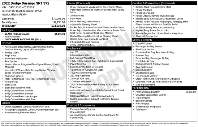 DB Black Crystal Clearcoat 2022 Dodge Durango SRT 392 AWD 8-Speed Automatic SRT HEMI 6.4L V8 MDS