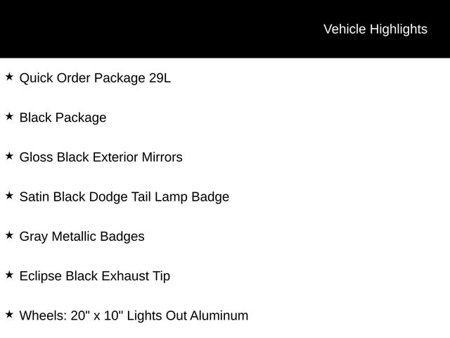 AWD, Black Package, Eclipse Black Exhaust Tip, Gloss Black Exterior Mirrors, Gray Metallic Badges, Quick Order Package 29L, Satin Black Dodge Tail Lamp Badge, Wheels: 20" x 10" Lights Out Aluminum.