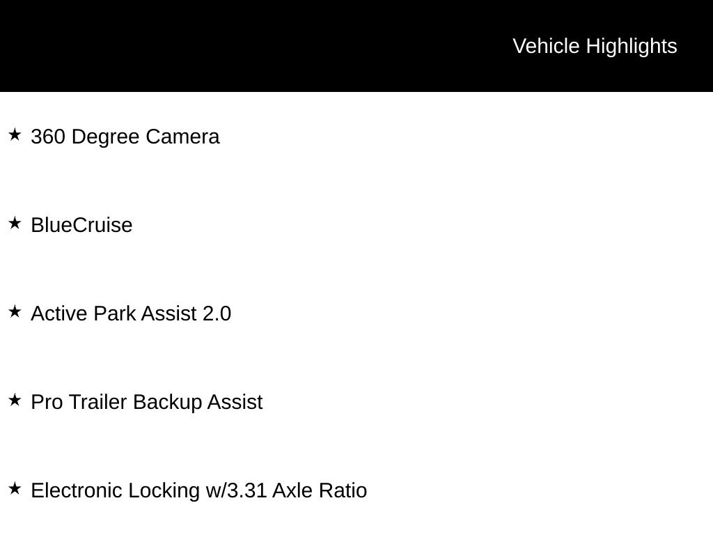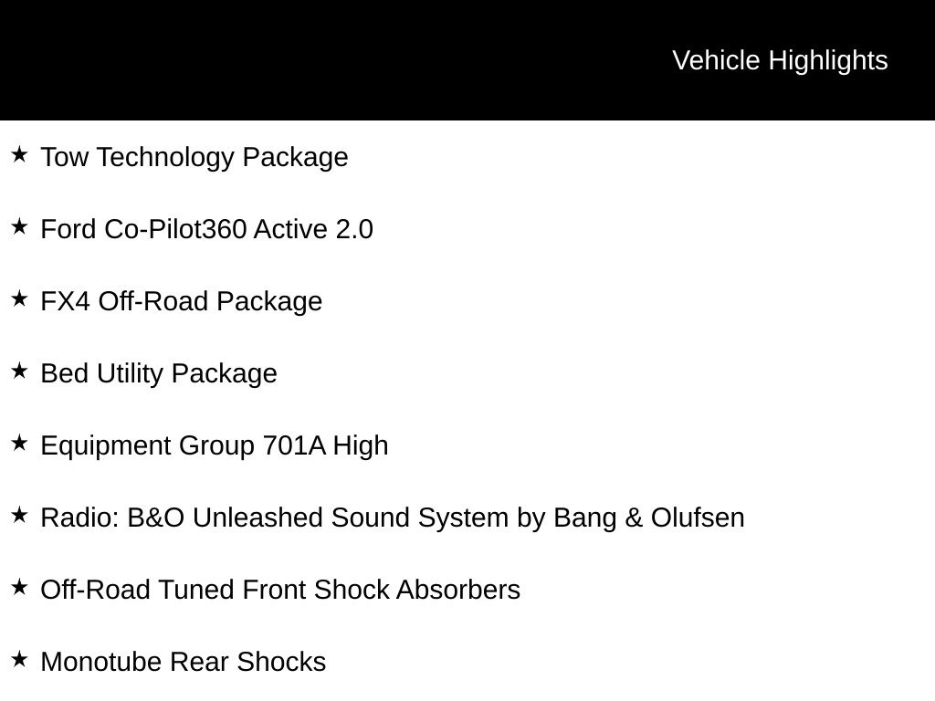 4WD, 360 Degree Camera, 4x4 FX4 Off-Road Bodyside Decal, Active Park Assist 2.0, Bed Utility Package, BlueCruise, BoxLink, Electronic Locking w/3.31 Axle Ratio, Equipment Group 701A High, Ford Co-Pilot360 Active 2.0, FX4 Off-Road Package, Hill Descent Control, LED Box Lighting, Monotube Rear Shocks, Off-Road Tuned Front Shock Absorbers, Power Tailgate, Pro Trailer Backup Assist, Radio: B&O Unleashed Sound System by Bang & Olufsen, Rock Crawl Mode, Tailgate Step w/Tailgate Work Surface, Tow Technology Package, Tray Style Floor Liner.