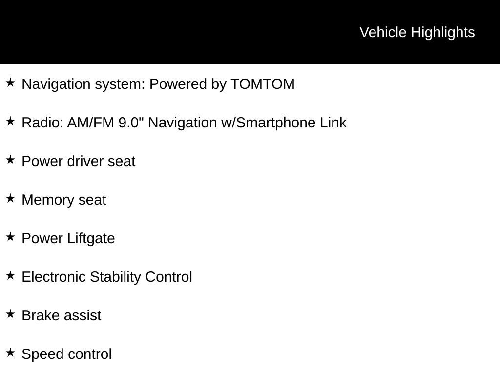 Android Auto & Apple CarPlay, Brake assist, Electronic Stability Control, Memory seat, Navigation system: Powered by TOMTOM, Power driver seat, Power Liftgate, Radio: AM/FM 9.0" Navigation w/Smartphone Link, Speed control, Wheels: 20" x 8J Two-Tone Alloy.